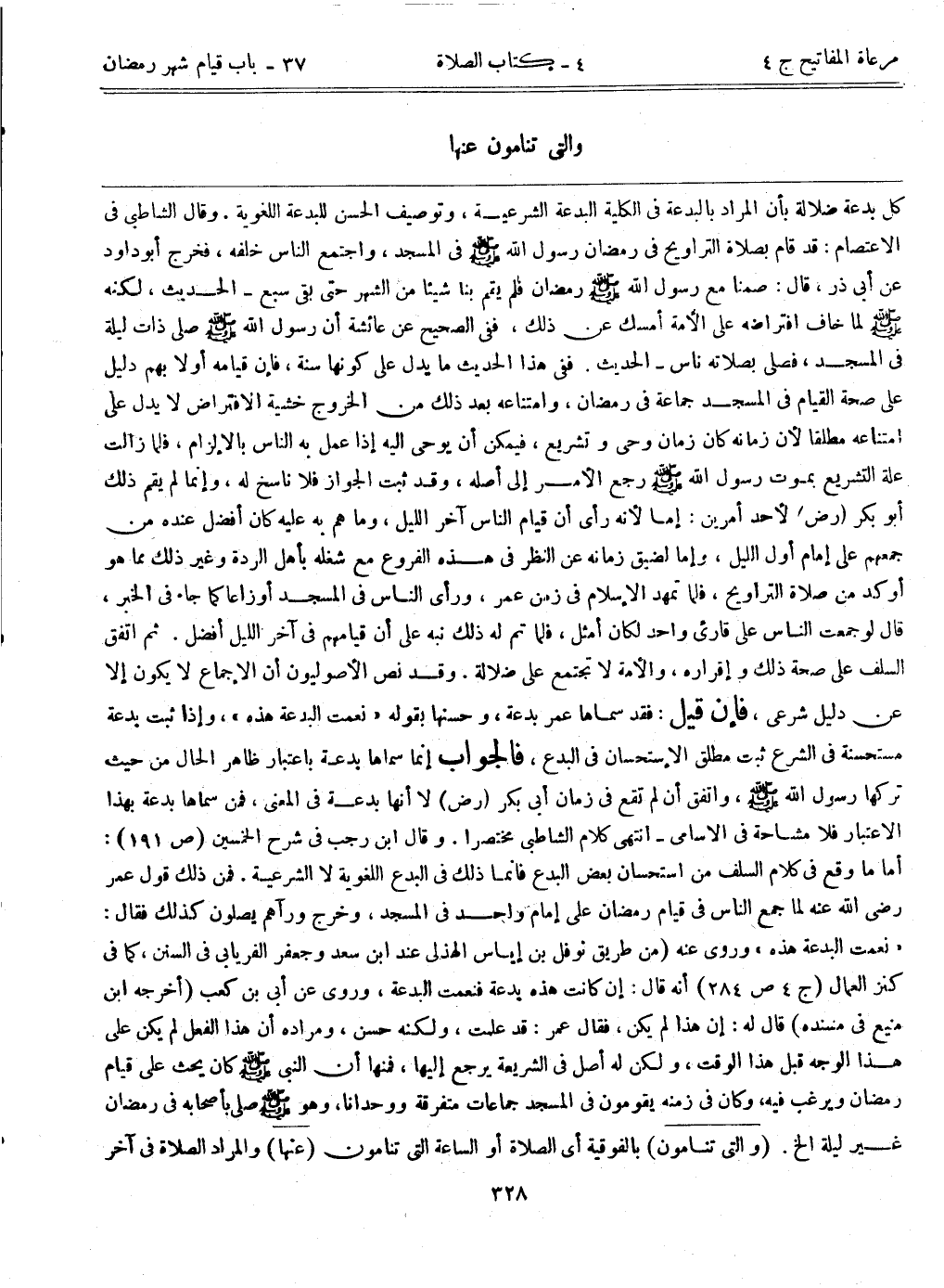 كل بدعة ضلالة، بأن المراد بالبدعة في الكلية البدعة الشرعية، وتوصيف الحسن للبدعة اللغوية. وقال الشاطبي في الاعتصام: قد قام بصلاة التراويح في رمضان رسول الله - صلى الله عليه وسلم - في المسجد، واجتمع الناس خلفه، فخرج أبوداود عن أبي ذر، قال: صمنا مع رسول الله - صلى الله عليه وسلم - رمضان فلم يقم بنا شيئاً من الشهر حتى بقي سبع-الحديث، لكنه - صلى الله عليه وسلم - لما خاف افتراضه على الأمة أمسك عن ذلك، ففي الصحيح عن عائشة: أن رسول الله - صلى الله عليه وسلم - صلى ذات ليلة في المسجد، فصلى بصلاته ناس-الحديث. ففي هذا الحديث ما يدل على كونها سنة، فإن قيامه أولاً بهم دليل على صحة القيام في المسجد جماعة في رمضان، وامتناعه بعد ذلك من الخروج خشية الافتراض لا يدل على امتناعه مطلقاً؛ لأن زمانه كان وحي وتشريع، فيمكن أن يوحى إليه إذا عمل به الناس بالإلزام، فلما زالت علة التشريع بموت رسول الله - صلى الله عليه وسلم - رجع الأمر إلى أصله، وقد ثبت الجواز فلا ناسخ له، وإنما لم يقم ذلك أبوبكر رضي الله عنه لأحد أمرين: إما لأنه رأى أن قيام الناس في آخر الليل، وما هم به عليه كان أفضل عنده من جمعهم على إمام أول الليل، وإما لضيق زمانه عن النظر في هذه الفروع، مع شغله بأهل الردة وغير ذلك مما هو أوكد من صلاة التراويح، فلما تمهد الإسلام في زمن عمر، ورأى الناس في المسجد أوزاعاً كما جاء في الخبر، قال: لو جمعت الناس على قاري واحد لكان أمثل، فلما تم له ذلك نبه على أن قيامهم في آخر الليل أفضل. ثم اتفق السلف على صحة ذلك وإقراره، والأمة لا تجتمع على ضلالة. وقد نص الأصوليون أن الإجماع لا يكون إلا عن دليل شرعي، فإن قيل: فقد سماها عمر بدعة، وحسنها بقوله "نعمت البدعة هذه"، وإذا ثبت بدعة مستحسنة في الشرع ثبت مطلق الاستحسان في البدع، فالجواب إنما سماها بدعة باعتبار ظاهر الحال من حيث تركها رسول الله - صلى الله عليه وسلم -، واتفق أن لم تقع في زمان أبي بكر رضي الله عنه، لا أنها بدعة في المعنى، فمن سماها بدعة بهذا الاعتبار فلا مشاحة في الأسامي- انتهى كلام الشاطبي مختصراً. وقال ابن رجب في شرح الخمسين (ص191) : أما ما وقع في كلام السلف من استحسان بعض البدع فإنما ذلك في البدع اللغوية لا الشرعية. فمن ذلك قول عمر رضي الله عنه لما جمع الناس في قيام رمضان على إمام واحد في المسجد، وخرج ورآهم يصلون كذلك فقال: "نعمت البدعة هذه" وروى عنه (من طريق نوفل بن إياس الهذلي عند ابن سعد وجعفر الفريابي في السنن، كما في كنز العمال (ج4 ص284) أنه قال: إن كانت هذه بدعة فنعمت البدعة، وروي عن أبيّ بن كعب. (أخرجه ابن منيع في مسنده) قال له: إن هذا لم يكن، فقال عمر: قد علمت، ولكنه حسن، ومراده أن هذا الفعل لم يكن على هذا الوجه قبل هذا الوقت، ولكن له أصل في الشريعة يرجع إليها، فمنها أن النبي - صلى الله عليه وسلم - كان يحث على قيام رمضان ويرغب فيه، وكان في زمنه يقومون في المسجد جماعات متفرقة ووحدانا، وهو - صلى الله عليه وسلم - صلى بأصحابه في رمضان غير ليلة الخ. (والتي تنامون) بالفوقية أي الصلاة أو الساعة التي تنامون. (عنها) والمراد الصلاة في آخر