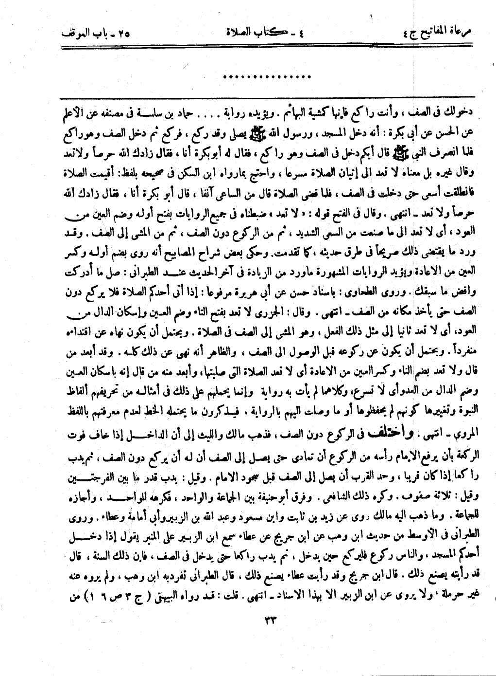 دخولك في الصف، وأنت راكع فإنها كمشية البهائم. ويؤيده رواية حماد بن سلمة في مصنفه عن الأعلم عن الحسن عن ابي بكرة: أنه دخل المسجد، ورسول الله - صلى الله عليه وسلم - يصلي وقد ركع، فركع ثم دخل الصف وهو راكع فلما انصرف النبي - صلى الله عليه وسلم - قال: أيكم دخل في الصف وهو راكعن فقال له أبوبكرة: أنا، فقال: زادك الله حرصاً ولا تعد، وقال غيره: بل معناه لا تعد إلى إتيان الصلاة مسرعاً، واحتج بما رواه ابن السكن في صحيحه بلفظ: أقيمت الصلاة فانطلقت أسعى حتى دخلت في الصف، فلما قضى الصلاة قال: من الساعي آنفاً، قال أبوبكرة أنا، فقال زادك الله حرصًا ولا تعد- انتهى. وقال في الفتح قوله: "لا تعد" ضبطناه في جميع الروايات بفتح أوله وضم العين من العود، أي لا تعد إلى ما صنعت من السعي الشديد، ثم من الركوع دون الصف، ثم من المشي إلى الصف. وقد ورد ما يقتضي ذلك صريحاً في طرق حديثه، كما تقدمت، وحكى بعض شراح المصابيح أنه روي بضم أوله وكسر العين من الإعادة، ويؤيد الروايات المشهورة ما ورد من الزيادة في آخر الحديث عند الطبراني: صل ما أدركت واقض ما سبقك. وروى الطحاوي: بإسناد حسن عن أبي هريرة مرفوعاً: إذا أتى احدكم الصلاة فلا يركع دون الصف حتى يأخذ مكانه من الصف- انتهى. وقال: الجزري لا تعد بفتح التاء وضم العين وإسكان الدال من العود، أي لا تعد ثانياً إلى مثل ذلك الفعل، وهو المشي إلى الصف في الصلاة. ويحتمل أن يكون نهاه عن اقتدائه منفرداً. ويحتمل أن يكون عن ركوعه قبل الوصول إلى الصف، والظاهر أنه نهى عن ذلك كله. وقد أبعد من قال: ولا تعد بضم التاء وكسر العين من الإعادة أي لا تعد الصلاة التي صليتها، وأبعد منه من قال إنه بإسكان العين وضم الدال من العَدو أي لا تسرع، وكلاهما لم يأت به رواية، وإنما يحملهم على ذلك في أمثاله من تحريفهم ألفاظ النبوة وتغييرها كونهم لم يحفظوها أو ما وصلت إليهم بالرواية، فيذكرون ما يحتمله الخط لعدم معرفتهم باللفظ المروي- انتهى. واخنلف في الركوع دون الصف، فذهب مالك والليث إلى أن الداخل إذا خاف فوت الركعة بأن يرفع الإمام رأسه من الركوع إن تمادى حتى يصل إلى الصف أن له أن يركع دون الصف، ثم يدب راكعاً إذا كان قريباً، وحد القرب أن يصل إلى الصف قبل سجود الامام. وقيل: يدب قدر ما بين الفرجتين. وقيل: ثلاثة صفوف. وكره ذلك الشافعي. وفرق أبوحنيفة بين الجماعة والواحد، فكرهه للواحد، وأجازه للجماعة. وما ذهب إليه مالك روي عن زيد بن ثابت وابن مسعود وعبد الله بن الزبير وأبي أمامة وعطاء. وروى الطبراني في الأوسط من حديث ابن وهب عن ابن جريج عن عطاء سمع ابن الزبير على المنبر يقول: إذا دخل أحدكم المسجد، والناس ركوع فليركع حين يدخل، ثم يدب راكعاً حتى يدخل في الصف، فإن ذلك السنة، قال: قد رأيته يصنع ذلك. قال ابن جريج: وقد رأيت عطاء يصنع ذلك، قال الطبراني: تفرد به ابن وهب، ولم يروه عنه غير حرملة، ولا يروى عن ابن الزبير إلا بهذا الإسناد- انتهى. قلت: قد رواه البيهقي (ج3 ص16) من