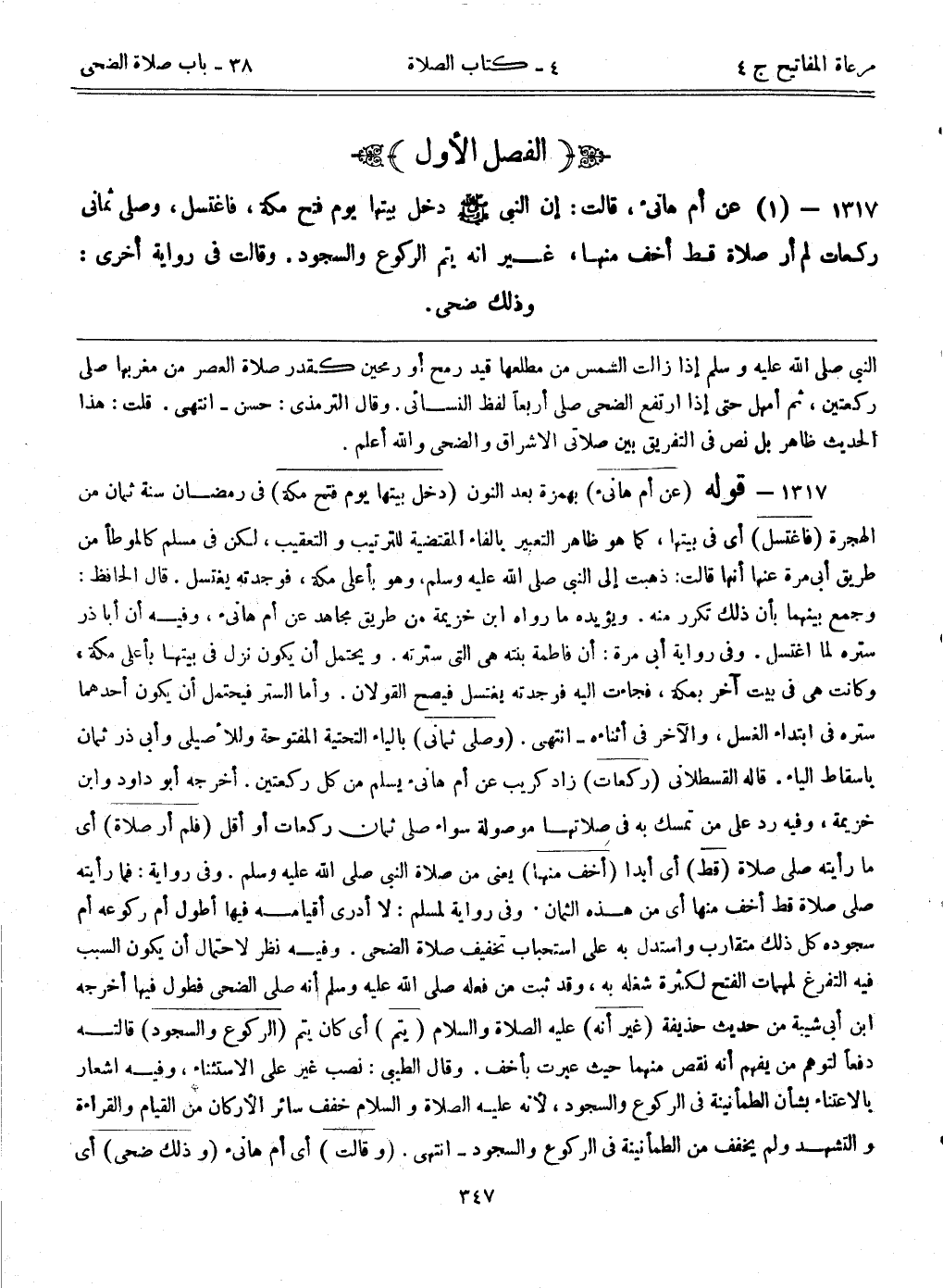 1317- (1) عن أم هانئ، قالت: ((إن النبي - صلى الله عليه وسلم - دخل بيتها يوم فتح مكة، فاغتسل، وصلى ثماني ركعات لم أر صلاة قط أخف منها، غير أنه يتم الركوع والسجود. وقالت في رواية أخرى: وذلك ضحى)) .