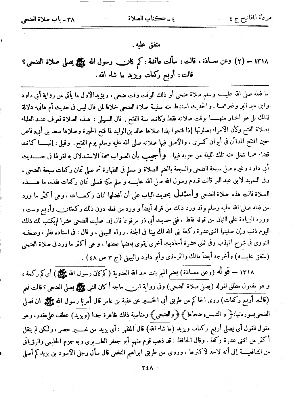1318- (2) وعن معاذة، قالت: سألت عائشة: ((كم كان رسول الله - صلى الله عليه وسلم - يصلي صلاة الضحى؟