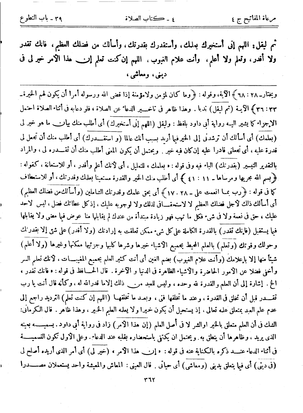 ويختار} الآية [28: 68] ، وقوله: {وما كان لمؤمن ولا مؤمنة إذا قضى الله ورسوله أمراً أن يكون لهم الخيرة} الآية [33: 36] . (ثم ليقل) ندباً. وهذا ظاهر في تأخير الدعاء عن الصلاة، فلو دعا به في أثناء الصلاة احتمل الإجزاء، كما يشير إليه رواية أبي داود بلفظ: وليقل. (اللهم إني أستخيرك) أي أطلب منك بيان ما هو خير لي. (بعلمك) أي أسألك أن ترشدني إلى الخير فيما أريد بسبب أنك عالماً. (واستقدرك) أي أطلب منك أن تجعل لي قدرة عليه، أي تجعلني قادراً عليه إن كان فيه خير. ويحتمل أن يكون المعنى أطلب منك أن تقدره لي، والمراد بالتقدير التيسير. (بقدرتك) الباء فيه وفي قوله: "بعلمك" للتعليل، أي لأنك أعلم وأقدر، أو للاستعانة، كقوله: {بسم الله مجريها ومرساها} [11: 41] أي أطلب منك الخير والقدرة مستعيناً بعلمك وقدرتك، أو للاستعطاف كما في قوله: {رب بما أنعمت علي} [28: 17] أي بحق علمك وقدرتك الشاملين. (وأسألك من فضلك العظيم) أي أسألك ذلك لأجل فضلك العظيم لا لاستحقاقي لذلك ولا لوجوبه عليك، إذ كل عطائك فضل، ليس لأحد عليك حق في نعمة ولا في شيء، فكل ما تهب فهو زيادة مبتدأة من عندك لم يقابلها منا عوض فيما مضى ولا يقابلها فيما يستقبل. (فإنك تقدر) بالقدرة الكاملة على كل شيء ممكن تعلقت به إرادتك. (ولا أقدر) على شيء إلا بقدرتك وحولك وقوتك. (وتعلم) بالعلم المحيط بجميع الأشياء خيرها وشرها كليها وجزئيها ممكنها وغيرها. (ولا أعلم) شيئاً منها إلا بإعلامك. (وأنت علام الغيوب) بضم الغين أي أنت كثير العلم بجميع المغيبات؛ لأنك تعلم السر وأخفى فضلاً عن الأمور الحاضرة والأشياء الظاهرة في الدنيا والآخرة. قال الحافظ في قوله: "فإنك تقدر"الخ. إشارة إلى أن العلم والقدرة لله وحده، وليس للعبد من ذلك إلا ما قدر الله له، وكأنه قال أنت يا رب تقدر قبل أن تخلق في القدرة، وعندما تخلقها فتى، وبعد ما تخلقها. (اللهم أن كنت تعلم) الترديد راجع إلى عدم علم العبد بمتعلق علمه تعالى، إذ يستحيل أن يكون خيراً ولا يعلمه العليم الخبير، وهذا ظاهر. قال الكرماني: الشك في أن العلم متعلق بالخير أو الشر لا في أصل العلم. (إن هذا الأمر) زاد في رواية أبي داود. يسميه بعينه الذي يريد، وظاهرها أن ينطق به. ويحتمل أن يكتفي باستحضاره بقلبه عند الدعاء. وعلى الأول تكون التسمية في أثناء الدعاء عند ذكره بالكناية عنه في قوله: "إن هذا الأمر". (خير لي) أي أمر الذي أريده أصلح لي. (في ديني) أي فيما يتعلق بديني. (ومعاشي) أي حياتي. قال العيني: المعاش والمعيشة واحد يستعملان مصدراً