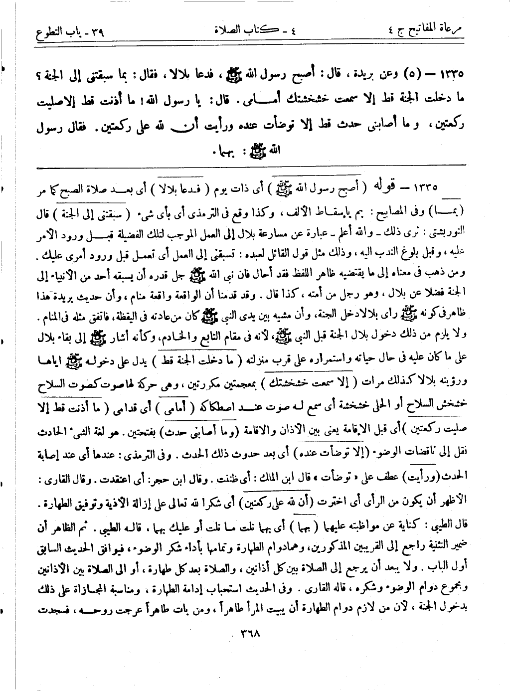 1335- قوله: (أصبح رسول الله - صلى الله عليه وسلم -) أي ذات يوم. (فدعا بلالاً) أي بعد صلاة الصبح كما مر. (بما) وفي المصابيح: بم بإسقاط الألف، وكذا وقع في الترمذي أي بأي شيء. (سبقتني إلى الجنة) قال التوربشتي نرى ذلك- والله أعلم- عبارة عن مسارعة بلال إلى العمل الموجب لتلك الفضيلة قبل ورود الأمر عليه، وقبل بلوغ الندب إليه، وذلك مثل قول القائل لعبده: تسبقني إلى العمل أي تعمل قبل ورود أمري عليك. ومن ذهب في معناه إلى ما يقتضيه ظاهر اللفظ فقد أحال فإن نبي الله - صلى الله عليه وسلم - جل قدرة أن يسبقه أحد من الأنبياء إلى الجنة فضلاً عن بلال، وهو رجل من أمته، كذا قال. وقد قدمنا أن الواقعة واقعة منام، وأن حديث بريدة هذا ظاهر في كونه - صلى الله عليه وسلم - رأى بلالا دخل الجنة، وأن مشيه بين يدي النبي - صلى الله عليه وسلم - كان من عادته في اليقظة، فاتفق مثله في المنام. ولا يلزم من ذلك دخول بلال الجنة قبل النبي - صلى الله عليه وسلم -؛ لأنه في مقام التابع والخادم، وكأنه أشار - صلى الله عليه وسلم - إلى بقاء بلال على ما كان عليه في حال حياته واستمراره على قرب منزلته. (ما دخلت الجنة قط) يدل على دخوله - صلى الله عليه وسلم - إياها ورؤيته بلالاً كذلك مرات. (إلا سمعت خشخشتك) بمعجمتين مكررتين، وهي حركة لها صوت كصوت السلاح خشخش السلاح أو الحلي خشخشة أي سمع له صوت عند اصطكاكه. (أمامي) أي قدامي. (ما أذنت قط إلا صليت ركعتين) أي قبل الإقامة يعني بين الأذان والإقامة. (وما أصابني حدث) بفتحتين. هو لغة الشيء الحادث نقل إلى ناقضات الوضوء. (إلا توضأت عنده) أي بعد حدوث ذلك الحدث. وفي الترمذي: عندها أي عند إصابة الحدث. (ورأيت) عطف على "توضأت". قال ابن الملك: أي ظننت. وقال ابن حجر: أي اعتقدت. وقال القاري: الأظهر أن يكون من الرأي أي اخترت. (أن لله عليّ ركعتين) أي شكراً لله تعالى على إزالة الأذية وتوفيق الطهارة. قال الطيبي: كناية عن مواظبته عليهما. (بهما) أي بهما نلت ما نلت أو عليك بهما، قاله الطيبي. ثم الظاهر أن ضمير التثنية راجع إلى القريبين المذكورين، وهما دوام الطهارة وتمامها بأداء شكر الوضوء، فيوافق الحديث السابق أول الباب. ولا يبعد أن يرجع إلى الصلاة بين كل أذانين، والصلاة بعد كل طهارة، أو إلى الصلاة بين كل الأذانين ومجموع دوام الوضوء وشكره، قاله القاري. وفي الحديث استحباب إدامة الطهارة، ومناسبة المجازاة على ذلك بدخول الجنة؛ لأن من لازم دوام الطهارة أن يبيت المرء طاهراً، ومن بات طاهراً عرجت روحه، فسجدت
