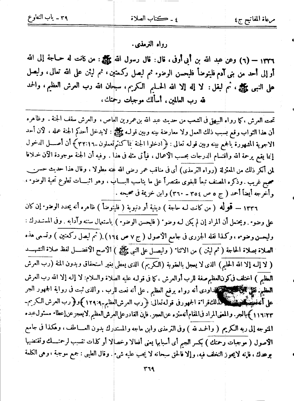 1336- قوله: (من كانت له حاجة) دينية أو دنيوية. (فليتوضأ) ظاهره أنه يجدد الوضوء إن كان على وضوء. ويحتمل أن المراد إن لم يكن له وضوء. (فليحسن الوضوء) باستعمال سننه وآدابه. وفي المستدرك: وليحسن وضوءه، وكذا نقله الجزري في جامع الأصول (ج7 ص164) . (ثم ليصل ركعتين) وتسمى هذه الصلاة بصلاة الحاجة. (ثم ليثن) من الإثناء. (وليصل على النبي - صلى الله عليه وسلم -) الأصح الأفضل لفظ صلاة التشهد. (لا إله إلا الله الحليم) الذي لا يعجل بالعقوبة. (الكريم) الذي يعطي بغير استحقاق وبدون المنة. (رب العرش العظيم) اختلف في كون العظيم صفة للرب أو العرش، كما في قوله عليه الصلاة والسلام: لا إله إلا الله رب العرش العظيم. نقل ابن التين عن الداودي أنه رواه برفع العظيم. على أنه نعت للرب، والذي ثبت في رواية الجمهور الجر على أنه نعت للعرش. وكذلك قراءة الجمهور في قوله تعالى: {رب العرش العظيم} [9: 129) و {رب العرش الكريم} [23: 116] بالجر. والمعنى المراد في المقام أنه منزه عن العجز. فإن القادر على العرش العظيم. لا يعجز عن إعطاء مسؤل عبده المتوجه إلى ربه الكريم. (والحمد لله) وفي الترمذي وابن ماجه والمستدرك بدون العاطف، وهكذا في جامع الأصول. (موجبات رحمتك) بكسر الجيم أي أسبابها يعني أفعالاً وخصالاً أو كلمات تتسبب لرحمتك وتقتضيها بوعدك، فإنه لا يجوز التخلف فيه، وإلا فالحق سبحانه لا يجب عليه شيء. وقال الطيبي: جمع موجبة، وهي الكلمة