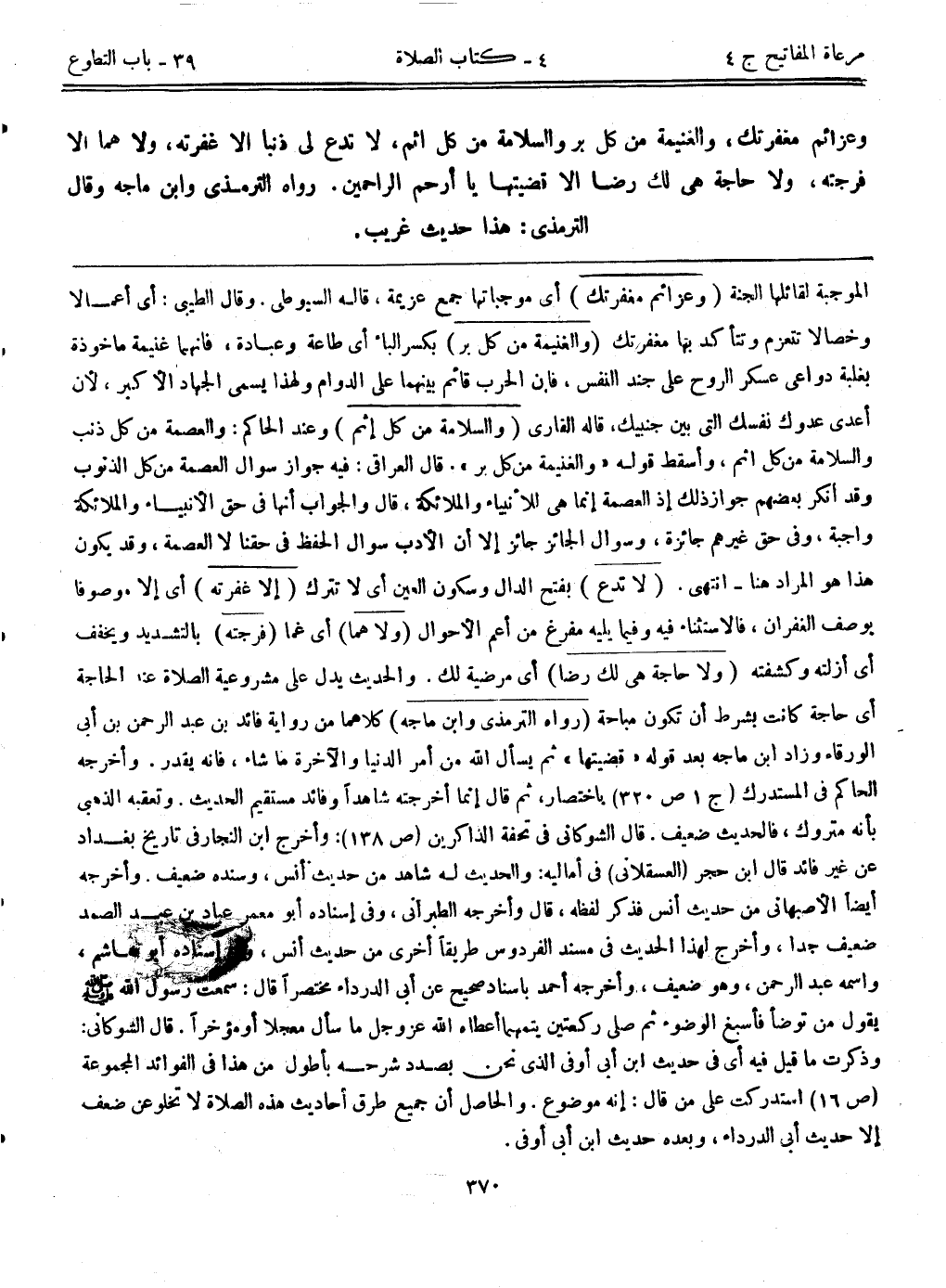 الموجبة لقائلها الجنة. (وعزائم مغفرتك) أي موجباتها جمع عزيمة، قاله السيوطي. وقال الطيبي: أي أعمالاً وخصالاً تتعزم وتتأكد بها مغفرتك. (والغنيمة من كل بر) بكسر الباء أي طاعة وعبادة، فإنهما غنيمة مأخوذة بغلبة دواعي عسكر الروح على جند النفس، فإن الحرب قائم بينهما على الدوام ولهذا يسمى الجهاد الأكبر؛ لأن أعدى عدوك نفسك التي بين جنبيك، قاله القاري. (والسلامة من كل إثم) وعند الحاكم: والعصمة من كل ذنب والسلامة من كل إثم، وأسقط قوله "غنيمة من كل بر". قال العراقي: فيه جواز سؤال العصمة من كل الذنوب، وقد أنكر بعضهم جواز ذلك إذ العصمة إنما هي للأنبياء والملائكة، قال: والجواب أنها في حق الأنبياء والملائكة واجبة، وفي حق غيرهم جائزة، وسؤال الجائز جائز إلا أن الأدب سؤال الحفظ في حقنا لا العصمة، وقد يكون هذا هو المراد هنا- انتهى. (لا تدع) بفتح الدال وسكون العين أي لا تترك. (إلا غفرته) أي إلا موصوفاً بوصف الغفران، فالاستثناء فيه وفيما يليه مفرغ من أعم الأحوال. (ولا هماً) أي غماً. (فرجته) بالتشديد ويخفف أي أزلته وكشفته. (ولا حاجة هي لك رضاً) أي مرضية لك. والحديث يدل على مشروعية الصلاة عند الحاجة أيّ حاجة كانت بشرط أن تكون مباحة. (رواه الترمذي وابن ماجه) كلاهما من رواية فائد بن عبد الرحمن بن أبي الورقاء، وزاد ابن ماجه بعد قوله "قضيتها" ثم يسأل الله من أمر الدنيا والآخرة ما شاء، فإنه يقدر. وأخرجه الحاكم في المستدرك (ج1 ص320) باختصاره، ثم قال: إنما أخرجته شاهداً، وفائد مستقيم الحديث. وتعقبه الذهبي بأنه متروك، فالحديث ضعيف. قال الشوكاني في تحفة الذاكرين (ص138) : وأخرج ابن النجار في تاريخ بغداد عن غير فائد. قال ابن حجر (العسقلاني) في أمالية: والحديث له شاهد من حديث أنس، وسنده ضعيف. وأخرجه أيضاً الأصبهاني من حديث أنس فذكر لفظه، قال: وأخرجه الطبراني، وفي إسناده أبومعمر عباد بن عبد الصمد ضعيف جداً، وأخرج لهذا الحديث في مسند الفردوس طريقاً أخرى من حديث أنس، وفي إسناده أبوهاشم، واسمه عبد الرحمن، وهو ضعيف، وأخرجه أحمد بإسناد صحيح عن أبي الدرداء مختصراً قال: سمعت رسول الله - صلى الله عليه وسلم - يقول من توضأ فأسبغ الوضوء ثم صلى ركعتين يتمهما أعطاه الله عزوجل ما سأل معجلاً أو مؤخراً. قال الشوكاني: وذكرت ما قيل فيه أي في حديث ابن أبي أوفي الذي نحن بصدد شرحه بأطول من هذا في الفوائد المجموعة (ص16) ، استدركت على من قال: إنه موضوع. والحاصل أن جميع طرق أحاديث هذه الصلاة لا تخلو عن ضعف إلا حديث أبي الدرداء، وبعده حديث ابن أبي أوفي.