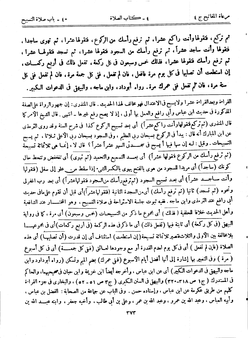 القراءة وبعد القراءة عشراً، ولا يسبح في الاعتدال فهو مخالف لهذا الحديث. قال المنذري: إن جمهور الرواة على الصفة المذكورة في حديث ابن عباس وأبي رافع والعمل بها أولى، إذ لا يصح رفع غيرها-انتهى. قال الشيخ: الأمر كما قال المنذري. (ثم تركع فتقولها وأنت راكع عشراً) أي بعد تسبيح الركوع كذا في شرح السنة، وقد روى الترمذي عن ابن المبارك أنه قال: يبدأ في الركوع بسبحان ربي العظيم، وفي السجود بسبحان ربي الأعلى ثلاثاً، ثم يسبح التسبيحات. وقيل: له إن سها فيها أيسبح في سجدتي السهو عشراً عشراً؟ قال لا، إنما هي ثلاثمائة تسبيحة. (ثم ترفع رأسك من الركوع فتقولها عشراً) أي بعد التسميع والتحميد. (ثم تهوي) أي تنخفض وتنحط حال كونك. (ساجداً) أي مريداً للسجود من هوى بالفتح يهوي بالكسر الشيء إذا سقط من علو إلى سفل. (فتقولها وأنت ساجد عشراً) أي بعد تسبيح السجود. (ثم ترفع رأسك من السجود فتقولها عشراً) أي بعد رب اغفرلي ونحوه. (ثم تسجد) ثانيا. (ثم ترفع رأسك) أي من السجدة الثانية. (فتقولها عشراً) أي قبل أن تقوم على ما في حديث أبي رافع عند الترمذي وابن ماجه. ففيه ثبوت جلسة الاستراحة في صلاة التسبيح، وهو المختار عند الشافعية وأهل الحديث خلافاً للحنفية. (فذلك) أي مجموع ما ذكر من التسبيحات. (خمس وسبعون) أي مرة، كما في رواية البيهقي. (في كل ركعة) أي ثابتة فيها. (تفعل ذلك) أي ما ذكر في هذه الركعة. (في أربع ركعات) أي في مجموعها بلا مخالفة بين الأولى والثلاث فتصير ثلاثمائة تسبيحة. (إن استطعت) استئناف أي إن قدرت. (أن تصليها) أي هذه الصلاة. (فإن لم تفعل) أي في كل يوم لعدم القدرة أو مع وجودها لعائق. (ففي كل جمعة) أي في كل أسبوع. (مرة) وفي التعبير بها إشارة إلى أنها أفضل أيام الأسبوع. (ففي عمرك) بضم الميم وتسكن. (رواه أبوداود وابن ماجه والبيهقي في الدعوات الكبير) أي عن ابن عباس، وأخرجه أيضاً ابن خزيمة وابن حبان في صحيحيهما، والحاكم في المستدرك (ج1:ص318-320) والبيهقي في السنن الكبرى (ج3:ص51-52) ، والبخاري في جزء القراءة كلهم من طريق عكرمة عن ابن عباس، وإسناده حسن. وفي الباب عن جماعة من الصحابة: الفضل بن عباس، وأبيه العباس، وعبد الله بن عمرو، وعبد الله بن عمر، وعلي بن أبي طالب، وأخيه جعفر، وابنه عبد الله بن