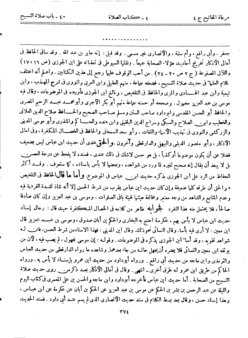 جعفر، وأبي رافع، وأم سلمة، والأنصاري غير مسمى. وقد قيل: إنه جابر بن عبد الله. وقد ساق الحافظ في أمالي الأذكار تخريج أحاديث هؤلاء الصحابة جميعاً. ونقلها السيوطي في تعقباته على ابن الجوزي (ص16، 17) واللآتي المصنوعة (ج2:ص20-24) من أحب الوقوف عليها رجع إلى هذين الكتابين. واعلم أنه اختلف كلام العلماء في حديث صلاة التسبيح، فضعفه جماعة، منهم العقيلي وابن العربي والنووي في شرح المهذب، وابن تيمية وابن عبد الهادي والمزي والحافظ في التلخيص، وبالغ ابن الجوزي فأورده في الموضوعات، وقال: فيه موسى بن عبد العزيز مجهول. وصححه أو حسنه جماعة منهم أبوبكر الآجري وأبومحمد عبد الرحيم المصري والحافظ أبوالحسن المقدسي وأبوداود صاحب السنن ومسلم صاحب الصحيح والحافظ صلاح الدين العلائي والخطيب وابن الصلاح والسبكي وسراج الدين البلقيني وابن مندة والحاكم والمنذري وأبوموسى المديني والزركشي والنووي في تهذيب الأسماء واللغات، وأبوسعد السمعاني والحافظ في الخصال المكفرة، وفي أمالي الأذكار، وأبومنصور الديلمي والبيهقي والدارقطني وآخرون. والحق عندي أن حديث ابن عباس ليس بضعيف فضلاً عن أن يكون موضوعاً أو كذباً، بل هو حسن لا شك في ذلك عندي، فسنده لا ينحط عن درجة الحسن، بل لا يبعد أن يقال إنه صحيح لغيره لما ورد من شواهده، وبعضها لا بأس بإسناده، كما ستعرف. وقد أكثر الحفاظ من الرد على ابن الجوزي بذكره حديث ابن عباس في الموضوع. وأما ما قال الحافظ في التلخيص: "والحق أن طرقه كلها ضعيفة وإن كان حديث ابن عباس يقرب من شرط الحسن إلا أنه شاذ لشدة الفردية فيه وعدم المتابع والشاهد من وجه معتبر، ومخالفة هيئتها لهيئة باقي الصلوات. وموسى بن عبد العزيز وإن كان صادقاً صالحاً، فلا يحتمل منه هذا التفرد، فجوابه ظاهر من كلامه في الخصال المكفرة حيث قال: رجال إسناد حديث ابن عباس لا بأس بهم، عكرمة احتج به البخاري والحكم بن أبان صدوق، وموسى بن عبد العزيز قال ابن معين: لا أرى فيه بأساً. وقال النسائي نحو ذلك. وقال ابن المديني: فهذا الإسناد من شرط الحسن، فإن له شواهد تقويه، وقد أساء ابن الجوزي بذكره في الموضوعات. وقوله: إن موسى مجهول، لم يصب فيه؛ لأن من يوثقه ابن معين والنسائي فلا يضره أن يجهل حاله من جاء بعدهما. وشاهده ما رواه الدارقطني من حديث العباس والترمذي وابن ماجه من حديث أبي رافع. ورواه أبوداود من حديث ابن عمرو بإسناد لا بأس به. ورواه الحاكم من طريق ابن عمرو له طرق أخرى-انتهى. وقال في أمالي الأذكار بعد ذكر من روى حديث صلاة التسبيح من الصحابة: أما حديث ابن عباس فأخرجه أبوداود وابن ماجه والحسن بن علي المعمري في كتاب اليوم والليلة عن عبد الرحمن بن بشر بن الحكم عن موسى بن عبد العزيز عن الحكم بن أبان عن عكرمة عن ابن عباس، وهذا إسناد حسن، وقال بعد بسط الكلام في سند حديث الأنصاري الذي لم يسم عند أبي داود: فسند الحديث