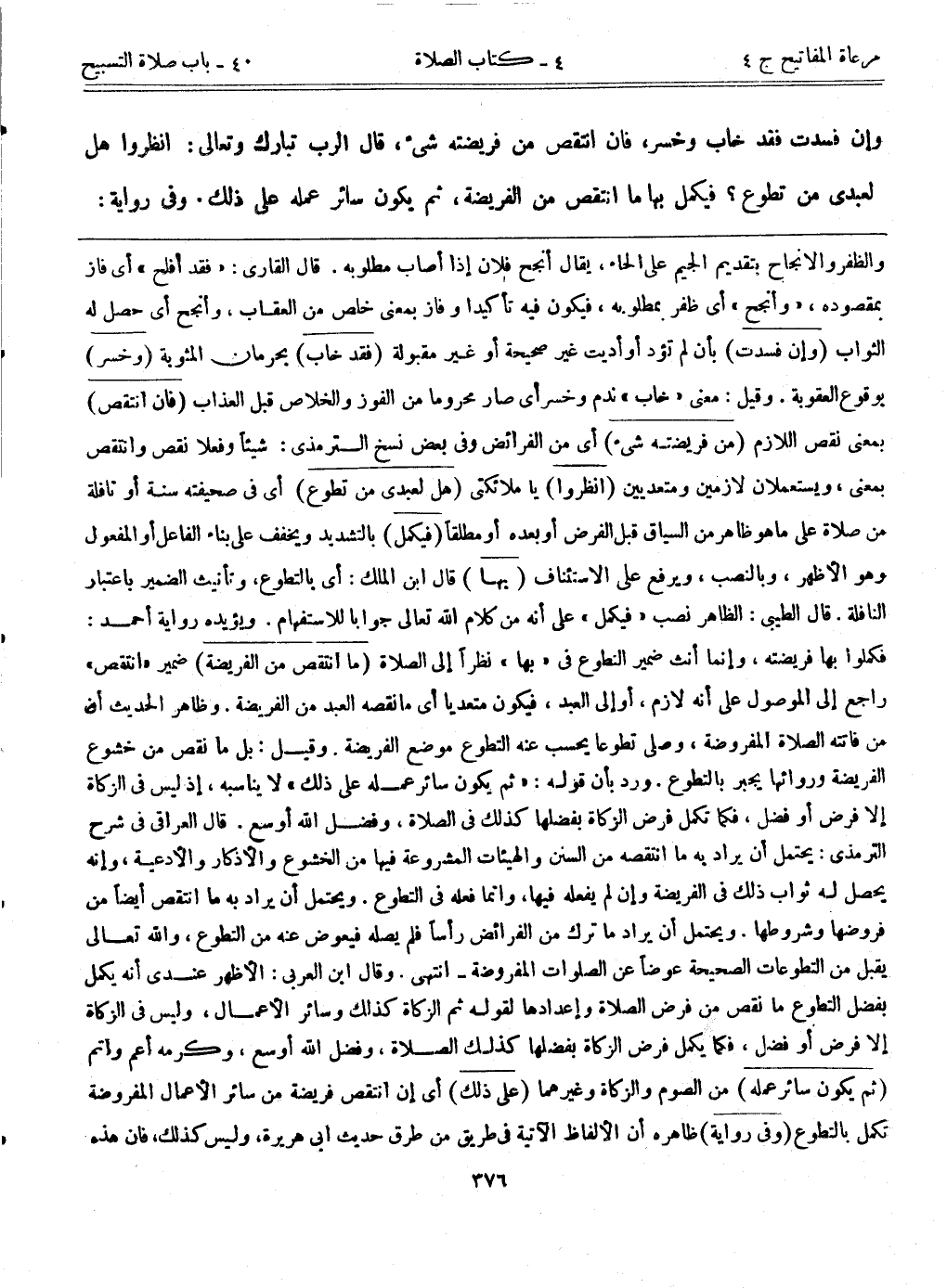 والظفر والإنجاح بتقديم الجيم على الحاء، يقال: أنجح فلان إذا أصاب مطلوبه. قال القاري: "فقد أفلح" أي فاز بمقصوده، "وأنجح" أي ظفر بمطلوبه، فيكون فيه تأكيداً وفاز بمعنى خلص من العقاب، وأنجح أي حصل له الثواب. (وإن فسدت) بأن لم تود أو أديت غير صحيحة أو غير مقبولة. (فقد خاب) بحرمان المثوبة. (وخسر) بوقوع العقوبة. وقيل: معنى "خاب" ندم وخسر أي صار محروماً من الفوز والخلاص قبل العذاب. (فإن انتقص) بمعنى نقص اللازم. (من فريضته شيء) أي من الفرائض وفي بعض نسخ الترمذي: شيئاً وفعلاً نقص وانتقص بمعنى، ويستعملان لازمين ومتعديين. (انظروا) يا ملائكتي. (هل لعبدي من تطوع) أي في صحيفته سنة أو نافلة من صلاة على ما هو ظاهر من السياق قبل الفرض أو بعده أو مطلقاً. (فيكمل) بالتشديد ويخفف على بناء الفاعل أو المفعول وهو الأظهر، وبالنصب، ويرفع على الاستئناف. (بها) قال ابن الملك: أي بالتطوع، وتأنيث الضمير باعتبار النافلة. قال الطيبي: الظاهر نصب "فيكمل" على أنه من كلام الله تعالى جواباً للاستفهام. ويؤيده رواية أحمد: فكملوا بها فريضته، وإنما أنث ضمير التطوع في "بها" نظراً إلى الصلاة. (ما انتقص من الفريضة) ضمير "انتقص" راجع إلى الموصول على أنه لازم، أو إلى العبد، فيكون متعدياً أي ما نقصه العبد من الفريضة. وظاهر الحديث أن من فاتته الصلاة المفروضة، وصلى تطوعاً يحسب عنه التطوع موضع الفريضة. وقيل: بل ما نقص من خشوع الفريضة ورواتها يجبر بالتطوع. ورد بأن قوله: "ثم يكون سائر عمله على ذلك" لا يناسبه، إذ ليس في الزكاة إلا فرض أو فضل، فكما تكمل فرض الزكاة بفضلها كذلك في الصلاة، وفضل الله أوسع. قال العراقي في شرح الترمذي: يحتمل أن يراد به ما انتقصه من السنن والهيئات المشروعية فيها من الخشوع والأذكار والأدعية، وإنه يحصل له ثواب ذلك في الفريضة وإن لم يفعله فيها، وإنما فعله في التطوع. ويحتمل أن يراد به ما انتقص أيضاً من فروضها وشروطها. ويحتمل أن يراد ما ترك من الفرائض رأساً فلم يصله، فيعوض عنه من التطوع، والله تعالى يقبل من التطوعات الصحيحة عوضاً عن الصلوات المفروضة-انتهى. وقال ابن العربي: الأظهر عندي أنه يكمل بفضل التطوع ما نقص من فرض الصلاة وإعدادها؛ لقوله ثم الزكاة كذلك وسائر الأعمال، وليس في الزكاة إلا فرض أو فضل، فكما يكمل فرض الزكاة بفضلها كذلك الصلاة، وفضل الله أوسع، وكرمه أعم وأتم. (ثم يكون سائر عمله) من الصوم والزكاة وغيرهما. (على ذلك) أي إن انتقص فريضة من سائر الأعمال المفروضة تكمل بالتطوع. (وفي رواية) ظاهره أن الألفاظ الآتية في طريق من طرق حديث أبي هريرة، وليس كذلك، فإن هذه