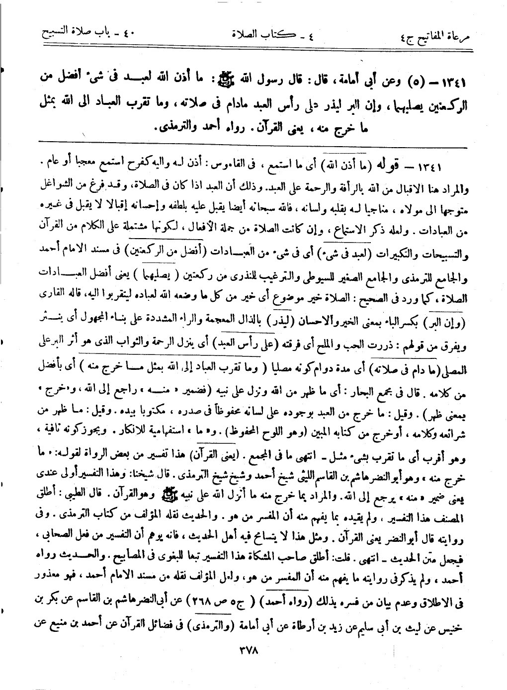 1341- قوله: (ما أذن الله) أي ما استمع، في القاموس: أذن له وإليه كفرح استمع معجباً أو عام. والمراد هنا الإقبال من الله بالرأفة والرحمة على العبد. وذلك أن العبد إذا كان في الصلاة، وقد فرغ من الشواغل متوجهاً إلى مولاه، مناجياً بقلبه ولسانه، فالله سبحانه أيضاً يقبل عليه بلطفه وإحسانه إقبالاً لا يقبل في غيره من العبادات. ولعله ذكر الاستماع، وإن كانت الصلاة من جملة الأفعال لكونها مشتملة على الكلام من القرآن والتسبيحات والتكبيرات. (لعبد في شيء) أي في شيء من العبادات. (أفضل من الركعتين) في مسند الإمام أحمد والجامع للترمذي والجامع الصغير للسيوطي والترغيب للمنذري من ركعتين. (يصليهما) يعني أفضل العبادات الصلاة، كما ورد في الصحيح: الصلاة خير موضوع، أي خير من كل ما وضعه الله لعباده ليتقربوا إليه، قاله القاري. (وإن البر) بكسر الباء بمعنى الخير والإحسان. (ليذر) بالذال المعجمة والراء المشددة على بناء المجهول، أي ينثر ويفرق من قولهم: ذررت الحب والملح أي فرقته. (على رأس العبد) أي ينزل الرحمة والثواب هو أثر البر على المصلي. (ما دام في صلاته) أي مدة دوام كونه مصلياً. (وما تقرب العباد الله بمثل ما خرج منه) أي بأفضل من كلامه. قال في مجمع البحار: أي ما ظهر من الله ونزل على نبيه. (فضمير "منه" راجع إلى الله، و"خرج" بمعنى ظهر) . وقيل: ما خرج من العبد بوجود على لسانه محفوظاً في صدره، مكتوباً بيده. وقيل: ما ظهر من شرائعه وكلامه، أو خرج من كتابة المبين. (وهو اللوح المحفوظ) . و"ما" استفهامية للإنكار. ويجوز كونه نافية، وهو أقرب أي ما تقرب بشيء مثل- انتهى ما في المجمع. (يعني القرآن) هذا تفسير من بعض الرواة لقوله: "ما خرج منه" وهو أبوالنضر هاشم بن القاسم الليثي شيخ أحمد وشيخ شيخ الترمذي. قال شيخنا: وهذا تفسير أولى عندي، يعني ضمير "منه" يرجع إلى الله. والمراد بما خرج منه ما أنزل الله على نبيه - صلى الله عليه وسلم - وهو القرآن. قال الطيبي: أطلق المصنف هذا التفسير، ولم يقيده بما يفهم منه أن المفسر من هو. والحديث نقله المؤلف من كتاب الترمذي. وفي روايته قال أبوالنضر يعني القرآن. ومثل لا يتسامح فيه أهل الحديث، فإنه يوهم أن التفسير من فعل الصحابي، فيجعل متن الحديث- انتهى. قلت: أطلق صاحب المشكاة هذا التفسير تبعاً للبغوي في المصابيح. والحديث رواه أحمد، ولم يذكر في روايته ما يفهم منه أن المفسر من هو، ولعل المؤلف نقله من مسند الإمام أحمد، فهو معذور في الإطلاق وعدم بيان من فسره بذلك. (رواه أحمد) (ج5 ص268) عن أبي النضر هاشم بن القاسم عن بكر بن خنيس عن ليث بن أبي سليم عن زيد بن أرطاة عن أبي أمامة. (والترمذي) في فضائل القرآن عن أحمد بن منيع عن