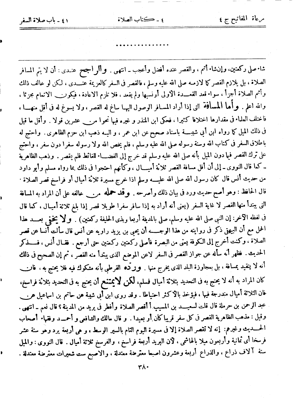 شاء صلى ركعتين، وإن شاء أتم، والقصر عنده أفضل وأعجب- انتهى. والراجح عندي: أن لا يتم المسافر الصلاة، بل يلازم القصر كما لازمه - صلى الله عليه وسلم -، فالقصر في السفر كالعزيمة عندي، لكن لو خالف ذلك وأتم الصلاة أجزأ، سواء قعد القعدة الأولى أو نسيها ولم يقعد، فلا تلزم الإعادة، فيكون الإتمام مجزئاً، والله أعلم. وأما المسافة التي إذا أراد المسافر الوصول إليها ساغ له القصر، ولا يسوغ له في أقل منها، فاختلف العلماء في مقدارها اختلافاً كثيراً، فحكى ابن المنذر وغيره فيها نحوا من عشرين قولاً. وأقل ما قيل في ذلك الميل كما رواه ابن أبي شيبة بإسناد صحيح عن ابن عمر، وإليه ذهب ابن حزم الظاهري. واحتج له بإطلاق السفر في كتاب الله وسنة رسوله - صلى الله عليه وسلم -، فلم يخص الله ولا رسوله سفراً دون سفر، واحتج على ترك القصر فيما دون الميل بأنه - صلى الله عليه وسلم - قد خرج إلى الفضاء للغائط فلم يقصر. وذهب الظاهرية – كما قال النووي- إلى أن أقل مسافة القصر ثلاثة أميال، وكأنهم احتجوا في ذلك بما رواه مسلم وأبوداود من حديث أنس قال: كان رسول الله - صلى الله عليه وسلم - إذا خرج مسيرة ثلاثة أميال أو فراسخ قصر الصلاة. قال الحافظ: وهو أصح حديث ورد في بيان ذلك وأصرحه. وقد حمله من خالفه على أن المراد به المسافة التي يبتدأ منها القصر لا غاية السفر. (يعني أنه أراد به إذا سافر سفراً طويلاً قصر إذا بلغ ثلاثة أميال، كما قال في لفظه الآخر: إن النبي - صلى الله عليه وسلم -، صلى بالمدينة أربعاً وبذي الحليفة ركعتين) . ولا يخفى بعد هذا الحمل مع أن البيهقي ذكر في روايته من هذا الوجه أن يحيى بن يزيد راويه عن أنس قال: سألت أنساً عن قصر الصلاة، وكنت أخرج إلى الكوفة يعني من البصرة فأصلي ركعتين ركعتين حتى أرجع. فقال أنس، فذكر الحديث. فظهر أنه سأله عن جواز القصر في السفر لا عن الموضع الذي يبتدأ منه القصر، ثم إن الصحيح في ذلك أنه لا يتقيد بمسافة، بل بمجاوزة البلد الذي يخرج منها. ورده القرطبي بأنه مشكوك فيه فلا يحتج به، فإن كان المراد به أنه لا يحتج به في التحديد بثلاثة أميال فمسلّم، لكن لا يمتنع أن يحتج به في التحديد بثلاثة فراسخ، فإن الثلاثة أميال مندرجة فيها، فيؤخذ بالأكثر احتياطاً. وقد روى ابن أبي شيبة عن حاتم بن إسماعيل عن عبد الرحمن بن حرملة قال: قلت لسعيد بن المسيب: أأقصر الصلاة وأفطر في بريد من المدينة؟ قال: نعم- انتهى. وقيل: مذهب الظاهرية القصر في كل سفر قريباً كان أو بعيداً. وقال مالك والشافعي وأحمد وفقهاء أصحاب الحديث وغيرهم: إنه لا تقصر الصلاة إلا في مسيرة اليوم التام بالسير الوسط، وهي أربعة برد وهو ستة عشر فرسخاً أي ثمانية وأربعون ميلاً بالهاشمي؛ لأن البريد أربعة فراسخ، والفرسخ ثلاثة أميال. قال النووي: والميل ستة آلاف ذراع، والذراع أربعة وعشرون إصبعاً معترضة ومعتدلة، والإصبع ست شعيرات معترضة معتدلة.