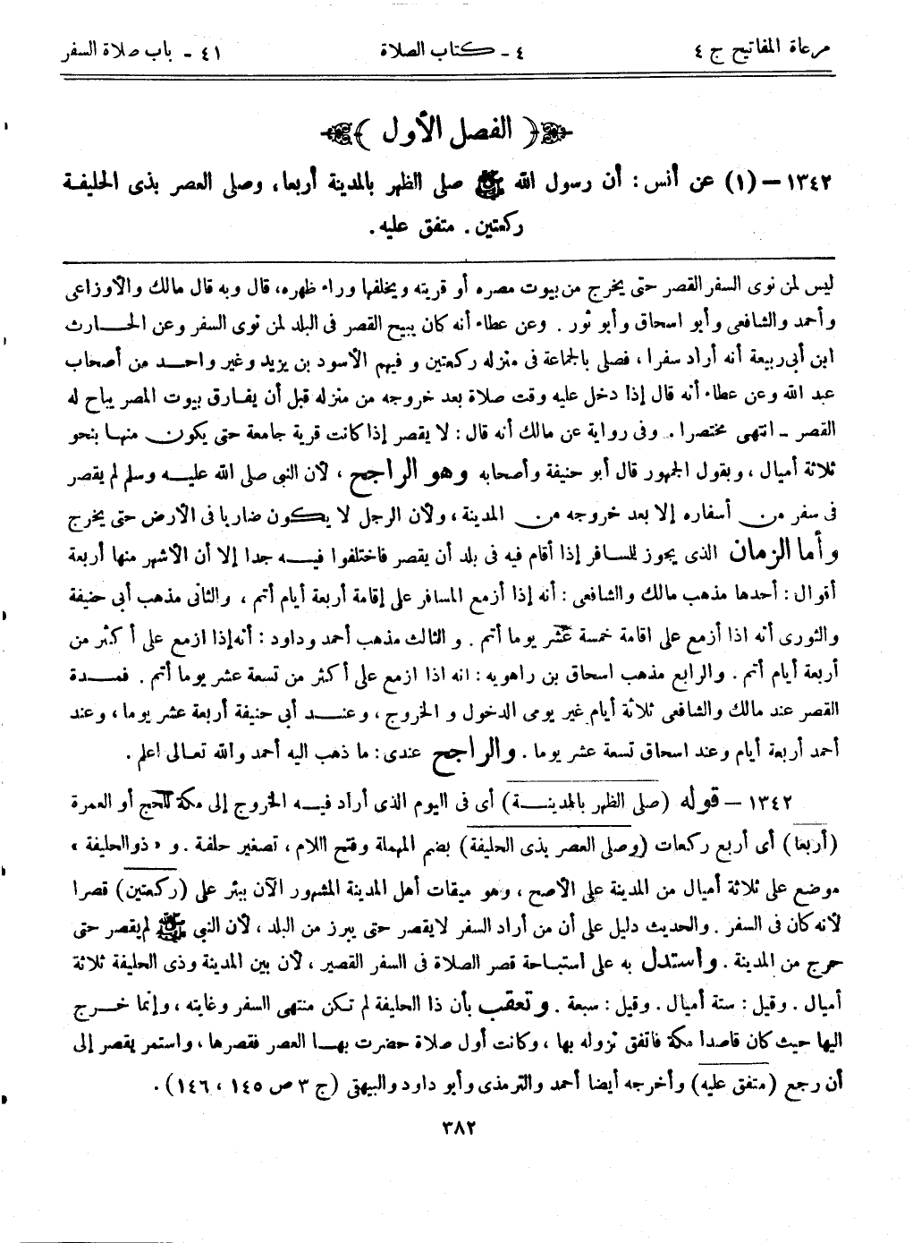 1342- (1) عن أنس: ((أن رسول الله - صلى الله عليه وسلم - صلى الظهر بالمدينة أربعاً، وصلى العصر بذي الحليفة