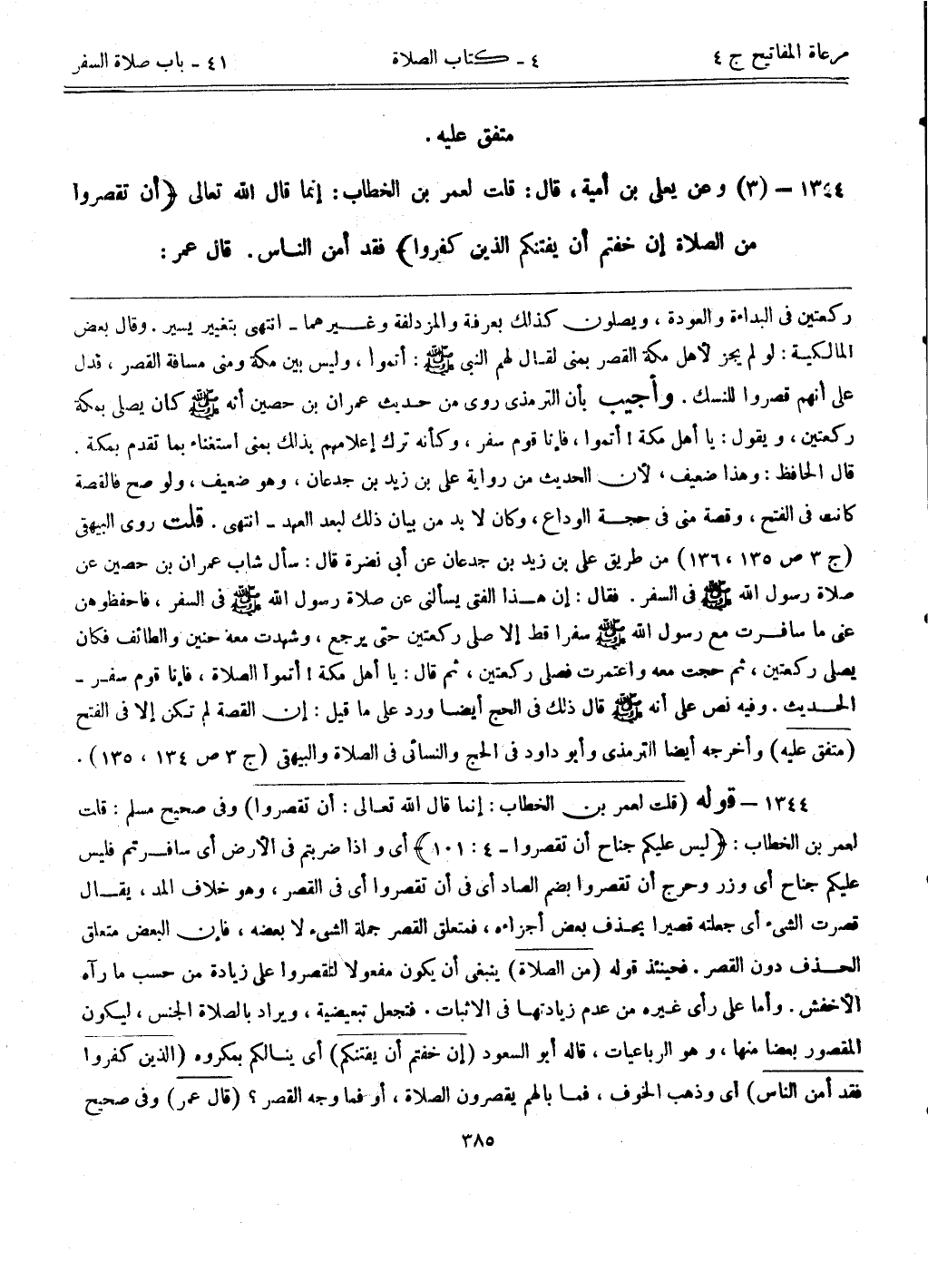 1344- (3) وعن يعلى بن أمية، قال. ((قلت لعمر بن الخطاب: إنما قال الله تعالى: {أن تقصروا من الصلاة إن خفتم أن يفتنكم الذين كفروا} فقد أمن الناس. قال عمر: