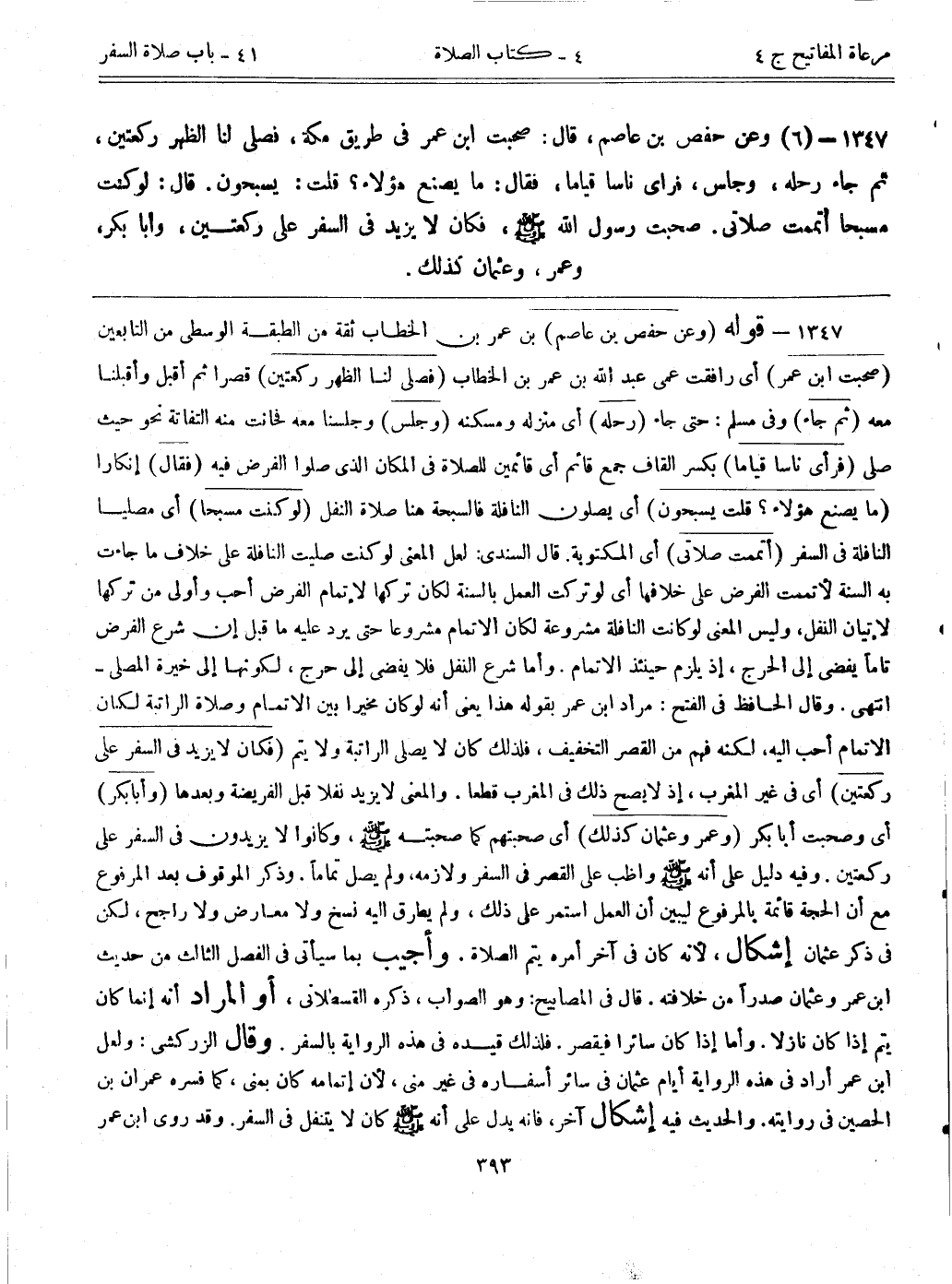 1347- قوله: (وعن حفص بن عاصم) بن عمر بن الخطاب ثقة من الطبقة الوسطى من التابعين (صحبت ابن عمر) أي رافقت عمي عبد الله بن عمر بن الخطاب. (فصلى لنا الظهر ركعتين) قصراً ثم أقبل وأقبلنا معه. (ثم جاء) وفي مسلم: حتى جاء. (رحله) أي منزله ومسكنه. (وجلس) وجلسنا معه، فحانت منه إلتفاتة نحو حيث صلى. (فرأى ناساً قياماً) بكسر القاف جمع قائم أي قائمين للصلاة في المكان الذي صلوا الفرض فيه. (فقال) إنكاراً: (ما يصنع هؤلاء؟ قلت: يسبحون) أي يصلون النافلة، فالسبحة هنا صلاة النفل، (لو كنت مسبحاً) أي مصلياً النافلة في السفر. (أتممت صلاتي) أي المكتوبة. قال السندي: لعل المعنى لو كنت صليت النافلة على خلاف ما جاءت به السنة لأتممت الفرض على خلافها، أي لو تركت العمل بالسنة لكان تركها لإتمام الفرض أحب وأولى من تركها لإتيان النفل، وليس المعنى لو كانت النافلة مشروعة لكان الإتمام مشروعاً حتى يرد عليه ما قيل: إن شرع الفرض تاماً يفضي إلى الحرج، إذ يلزم حينئذٍ الإتمام. وأما شرع النفل فلا يفضي إلى حرج، لكونها إلى خيرة المصلي- انتهى. وقال الحافظ في الفتح: مراد ابن عمر بقوله هذا يعني أنه لو كان مخيراً بين الإتمام وصلاة الراتبة لكان الإتمام أحب إليه، لكنه فهم من القصر التخفيف، فلذلك كان لا يصلي الراتبة ولا يتم. (فكان لا يزيد في السفر على ركعتين) أي في غير المغرب، إذ لا يصح ذلك في المغرب قطعاً. والمعنى لا يزيد نفلاً قبل الفريضة وبعدها. (وأبا بكر) أي وصحبت أبا بكر. (وعمر وعثمان كذلك) أي صحبتهم كما صحبته - صلى الله عليه وسلم -، وكانوا لا يزيدون في السفر على ركعتين. وفيه دليل على أنه - صلى الله عليه وسلم - واظب على القصر في السفر ولازمه، ولم يصل تماماً. وذكر الموقوف بعد المرفوع مع أن الحجة قائمة بالمرفوع ليبين أن العمل استمر على ذلك، ولم يطرق إليه نسخ ولا معارض ولا راجح، لكن في ذكر عثمان إشكال؛ لأنه كان في آخر أمره يتم الصلاة. وأجيب بما سيأتي في الفصل الثالث من حديث ابن عمر وعثمان صدراً من خلافته. قال في المصابيح: وهو الصواب، ذكره القسطلاني، أو المراد أنه إنما كان يتم إذا كان نازلاً. وأما إذا كان سائراً فيقصر. فلذلك قيده في هذه الرواية بالسفر. وقال الزركشي: ولعل ابن عمر أراد في هذه الرواية أيام عثمان في سائر أسفاره في غير منى؛ لأن إتمامه كان بمنى، كما فسره عمران بن الحصين في روايته. والحديث فيه إشكال آخر، فإنه يدل على أنه - صلى الله عليه وسلم - كان لا يتنفل في السفر. وقد روى ابن عمر