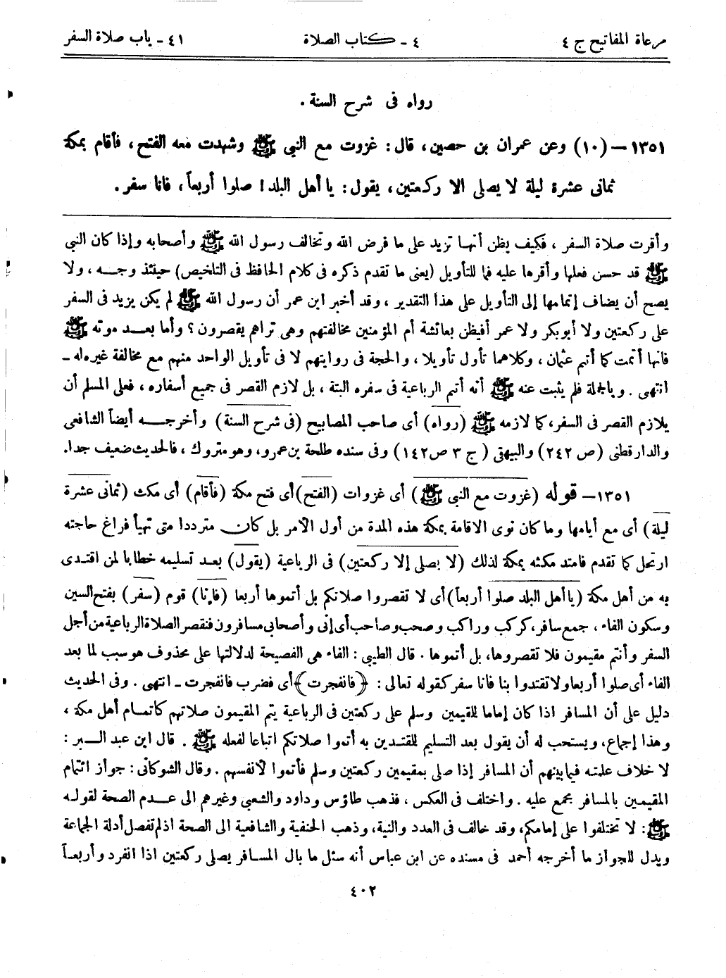 1351- (10) وعن عمران بن حصين، قال: ((غزوت مع النبي - صلى الله عليه وسلم - وشهدت معه الفتح، فقام بمكة ثماني عشرة ليلة لا يصلي إلا ركعتين، يقول: يا أهل البلد! صلوا أربعاً، فإنا سفر)) .
