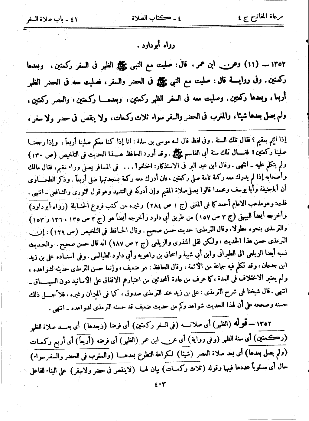 1352- قوله: (الظهر) أي صلاته. (في السفر ركعتين) أي فرضاً. (وبعدها) أي بعد صلاة الظهر. (ركعتين) أي سنة الظهر. (وفي رواية) أي عن ابن عمر. (الظهر) أي فرضه. (أربعاً) أي أربع ركعات. (ولم يصل بعدها) أي بعد صلاة العصر. (شيئاً) لكراهة التطوع بعدها. (والمغرب في الحضر والسفر سواء) حال أي مستويا عددها فيهما وقوله. (ثلاث ركعات) بيان لها. (لا ينقص في حضر ولا سفر) على البناء للفاعل