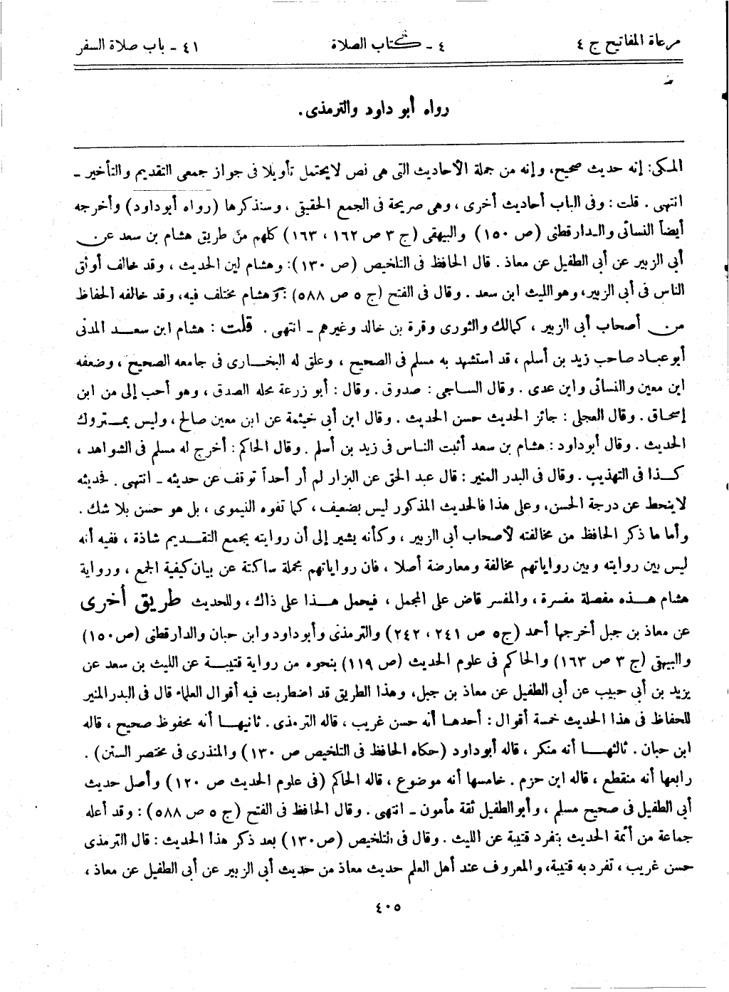 المكي: إنه حديث صحيح، وإنه جملة الأحاديث التي هي نص لا يحتمل تأويلاً في جواز جمعي التقديم والتأخير-انتهى. قلت: وفي الباب أحاديث أخرى، وهي صريحة في الجمع الحقيقي، وسنذكرها. (رواه أبوداود) وأخرجه أيضاً النسائي والدارقطني (ص150) والبيهقي (ج3ص162، 163) كلهم من طريق هشام بن سعد عن أبي الزبير عن أبي الطفيل عن معاذ. قال الحافظ في التلخيص (ص130) : وهشام لين الحديث، وقد خالف أوثق الناس في أبي الزبير، وهو الليث بن سعد. وقال في الفتح (ج5ص588) : وهشام مختلف فيه، وقد خالفه الحفاظ من أصحاب أبي الزبير، كمالك والثوري وقرة بن خالد وغيرهم-انتهى. قلت: هشام بن سعد المدني أبوعباد صاحب زيد بن أسلم، قد استشهد به مسلم في الصحيح، وعلق له البخاري في جامعه الصحيح، وضعفه ابن معين والنسائي وابن عدي. وقال الساجي: صدوق. وقال: أبوزرعة محله الصدق، وهو أحب إليّ من ابن إسحاق. وقال ابن أبي خيثمة عن ابن معين صالح، وليس بمتروك الحديث. وقال أبوداود: هشام بن سعد أثبت الناس في زيد بن أسلم. وقال الحاكم: أخرج له مسلم في الشواهد، كذا في التهذيب. وقال في البدر المنير: قال عبد الحق عن البزار: لم أر أحدا توقف عن حديثه- انتهى. فحديثه لا ينحط عن درجة الحسن، وعلى هذا فالحديث المذكور ليس بضعيف، كما تفوه النيموي، بل هو حسن بلا شك. وأما ما ذكر الحافظ من مخالفته لأصحاب أبي الزبير، وكأنه يشير إلى أن روايته بجمع التقديم شاذة، ففيه أنه ليس بين روايته وبين رواياتهم مخالفة ومعارضة أصلاً، فإن رواياتهم مجملة ساكتة عن بيان كيفية الجمع، ورواية هشام هذه مفصلة مفسرة، والمفسرة قاضٍ على المجمل، فيحمل هذا على ذاك، وللحديث طريق أخرى عن معاذ بن جبل أخرجها أحمد (ج5 ص241، 242) والترمذي وأبوداود وابن حبان والدارقطني (ص150) والبيهقي (ج3 ص163) والحاكم في علوم الحديث (ص119) بنحوه من رواية قتيبة عن الليث بن سعد عن يزيد بن أبي حبيب عن أبي الطفيل عن معاذ بن جبل، وهذا الطريق قد اضطربت فيه أقوال العلماء، قال في البدر المنير: للحفاظ في هذا الحديث خمسة أقوال: أحدها أنه حسن غريب، قاله الترمذي. ثانيها: أنه محفوظ صحيح، قاله ابن حبان. ثالثها: أنه منكر، قاله أبوداود. (حكاه الحافظ في التلخيص ص130) والمنذري في مختصر السنن) . رابعها: أنه منقطع، قاله ابن حزم. خامسها: أنه موضوع، قاله الحاكم. (في علوم الحديث ص120) وأصل حديث أبي الطفيل في صحيح مسلم، وأبوطفيل ثقة مأمون- انتهى. وقال الحافظ في الفتح (ج5 ص588) : وقد أعله جماعة من أئمة الحديث بتفرد قتيبة عن الليث. وقال في التلخيص (ص130) بعد ذكر هذا الحديث: قال الترمذي حسن غريب، تفرد به قتيبة، والمعروف عند أهل العلم حديث معاذ من حديث أبي الزبير عن أبي الطفيل عن معاذ،