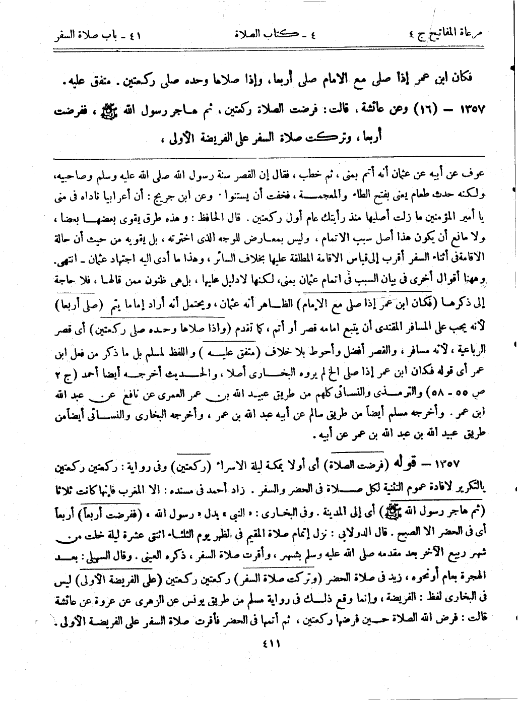 1357- (16) وعن عائشة، قالت: ((فرضت الصلاة ركعتين، ثم هاجر رسول الله - صلى الله عليه وسلم -، ففرضت أربعاً، وتركت صلاة السفر على الفريضة الأولى،