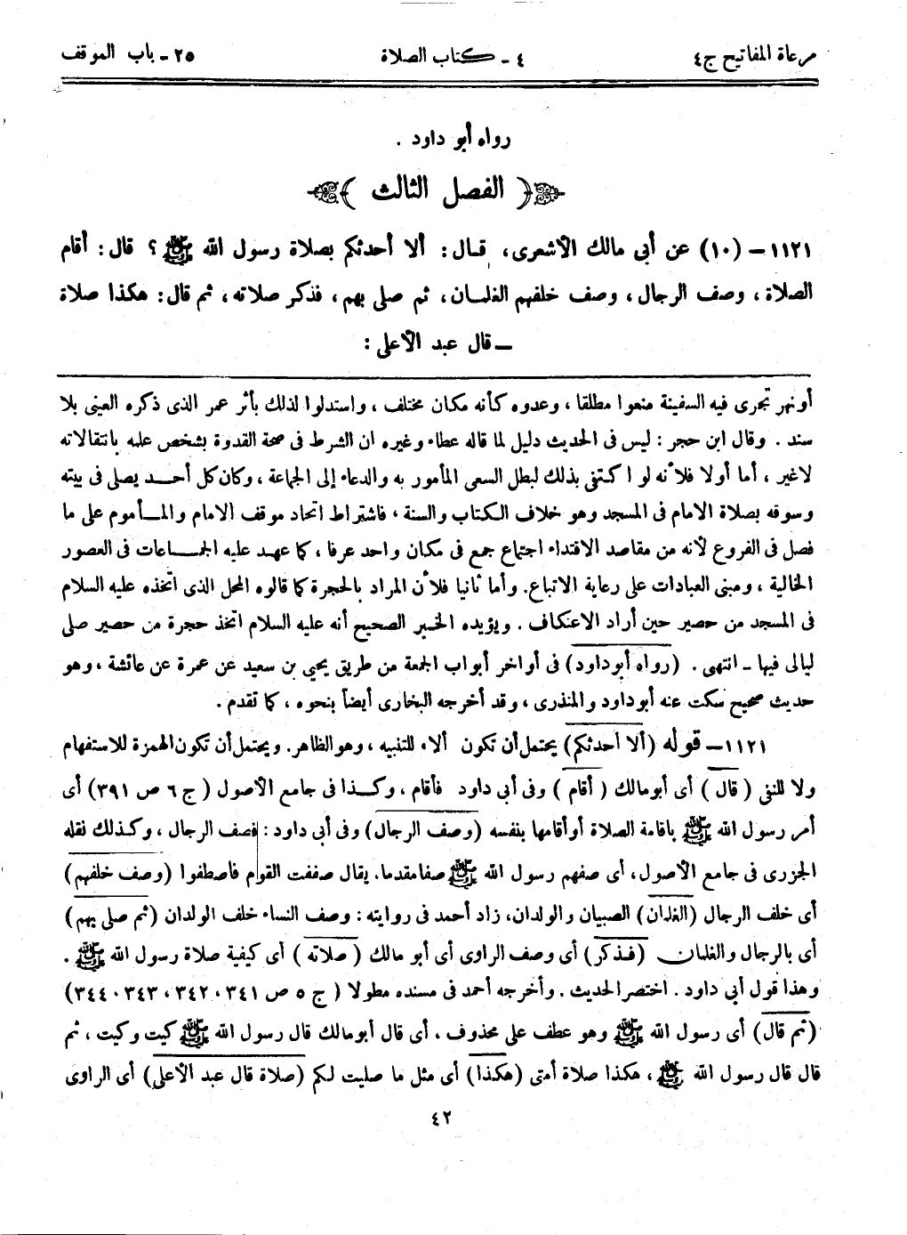 1121- (10) عن أبي مالك الأشعري، قال: ((ألا أحدثكم بصلاة رسول الله - صلى الله عليه وسلم -؟ قال: أقام الصلاة، وصف الرجال، وصف خلفهم الغلمان، ثم صلى بهم، فذكر صلاته، ثم قال: هكذا صلاة ـ قال عبد الأعلى: