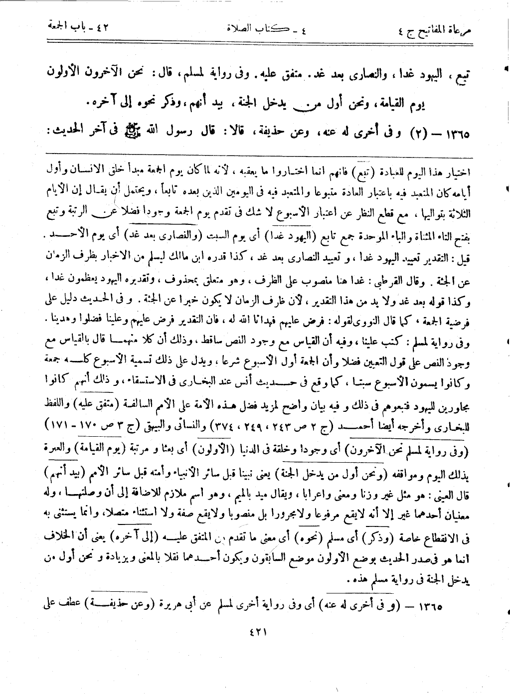 اختيار هذا اليوم للعبادة. (تبع) فإنهم إنما اختاروا ما يعقبه؛ لأنه لما كان يوم الجمعة مبدأ خلق الإنسان وأول أيامه كان المتعبد فيه باعتبار العادة متبوعاً، والمتعبد فيه في اليومين الذين بعده تابعاً، ويحتمل أن يقال إن الأيام الثلاثة بتواليها، مع قطع النظر عن اعتبار الأسبوع لا شك في تقديم يوم الجمعة وجوداً فضلاً عن الرتبة، وتبع بفتح التاء المثناة والباء الموحدة جمع تابع. (اليهود غداً) أي يوم السبت. (والنصارى بعد غد) أي يوم الأحد. قيل: التقدير تعييد اليهود غداً، وتعييد النصارى بعد غد، كذا قدره ابن مالك ليسلم من الإخبار بظرف الزمان عن الجثة. وقال القرطبي: غداً هنا منصوب على الظرف، وهو متعلق بمحذوف، وتقديره اليهود يعظمون غداً، وكذا قوله بعد غد ولابد من هذا التقدير؛ لأن ظرف الزمان لا يكون خبراً عن الجثة. وفي الحديث دليل على فريضة الجمعة، كما قاله النووي لقوله: فرض عليهم فهدانا الله له، فإن التقدير فرض عليهم فضلوا وهدينا. وفي رواية لمسلم: كتب علينا، وفيه أن القياس مع وجود النص ساقط، وذلك أن كلاً منهما قال بالقياس مع وجود النص على قول التعيين فضلاً وأن الجمعة أول الأسبوع شرعاً، ويدل على ذلك تسمية الأسبوع كله جمعة، وكانوا يسمون الأسبوع سبتاً، كما وقع في حديث أنس عند البخاري في الاستسقاء، وذلك أنهم كانوا مجاورين لليهود فتبعوهم في ذلك، وفيه بيان واضح لمزيد فضل هذه الأمة على الأمم السالفة. (متفق عليه) واللفظ لبخاري وأخرجه أيضاً أحمد (ج2 ص243، 249، 274) والنسائي والبيهقي (ج3 ص170-171) . (وفي رواية لمسلم نحن الآخرون) أي وجوداً وخلقة في الدنيا. (الأولون) أي بعثاً ومرتبة. (يوم القيامة) والعبرة بذلك اليوم ومواقفه. (ونحن أول من يدخل الجنة) يعني نبينا قبل سائر الأنبياء وأمته قبل سائر الأمم. (بيد أنهم) قال العيني: هو مثل غير وزناً ومعنى وإعراباً، ويقال ميد بالميم، وهو اسم ملازم للإضافة إلى أن وصلتها، وله معنيان أحدهما غير إلا أنه لا يقع مرفوعاً ولا مجروراً بل منصوباً ولا يقع صفة ولا استثناء متصلاً، وغنما يستثنى به في الانقطاع خاصة. (وذكر) أي مسلم. (نحوه) أي معنى ما تقدم من المتفق عليه. (إلى آخره) يعني أن الخلاف إنما هو في صدر الحديث بوضع الأولون موضع السابقون ويكون أحدهما نقلاً بالمعنى وبزيادة: ونحن أول من يدخل الجنة في رواية مسلم هذه.