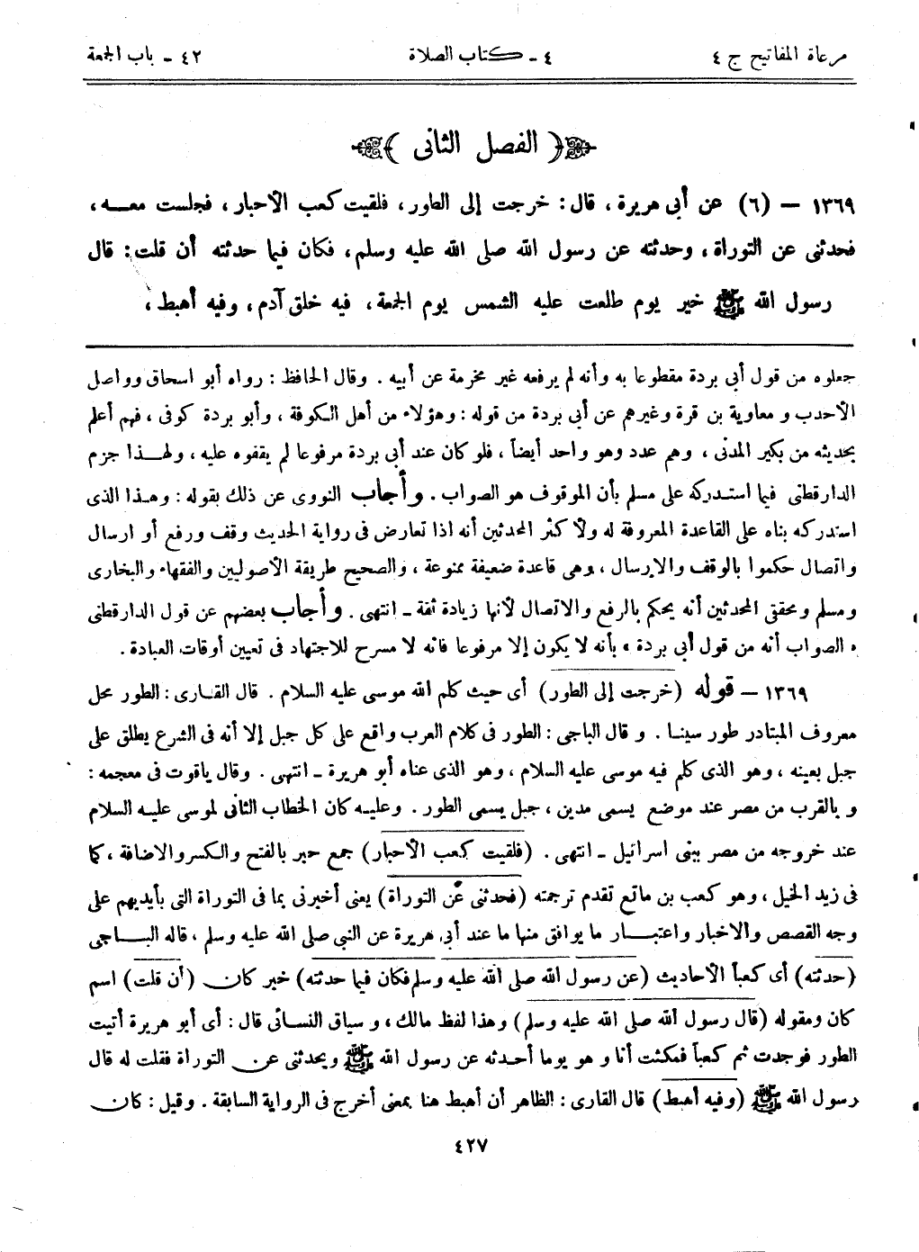 1369- (6) عن أبي هريرة، قال: خرجت إلى الطور، فلقيت كعب الأحبار، فجلست معه، فحدثني عن التوراة، وحدثته عن رسول الله صلى الله عليه وسلم، فكان فيما حدثته أن قلت: قال رسول الله - صلى الله عليه وسلم -: ((خير يوم طلعت عليه الشمس يوم الجمعة، فيه خلق آدم، وفيه أهبط،