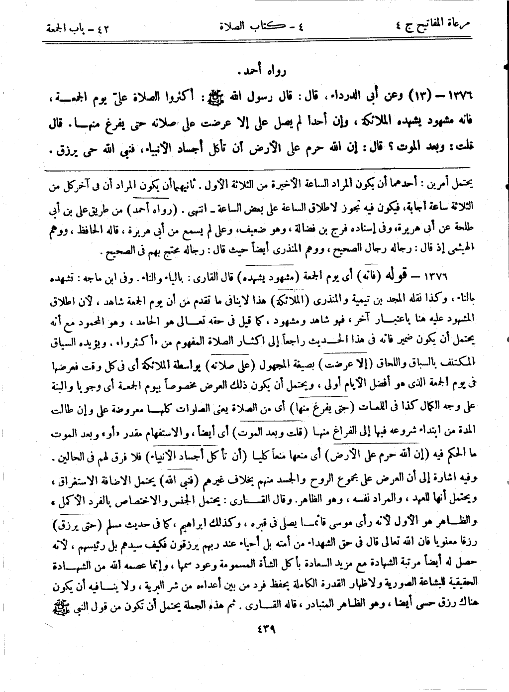 1376- (13) وعن أبي الدرداء، قال: قال رسول الله - صلى الله عليه وسلم -: ((أكثروا الصلاة عليّ يوم الجمعة، فإنه مشهود يشهده الملائكة، وإن أحداً لم يصل عليً إلا عرضت علي صلاته حتى يفرغ منها. قال قلت: وبعد الموت؟ قال: إن الله حرم على الأرض أن تأكل أجساد الأنبياء، فنبي الله حي يرزق))