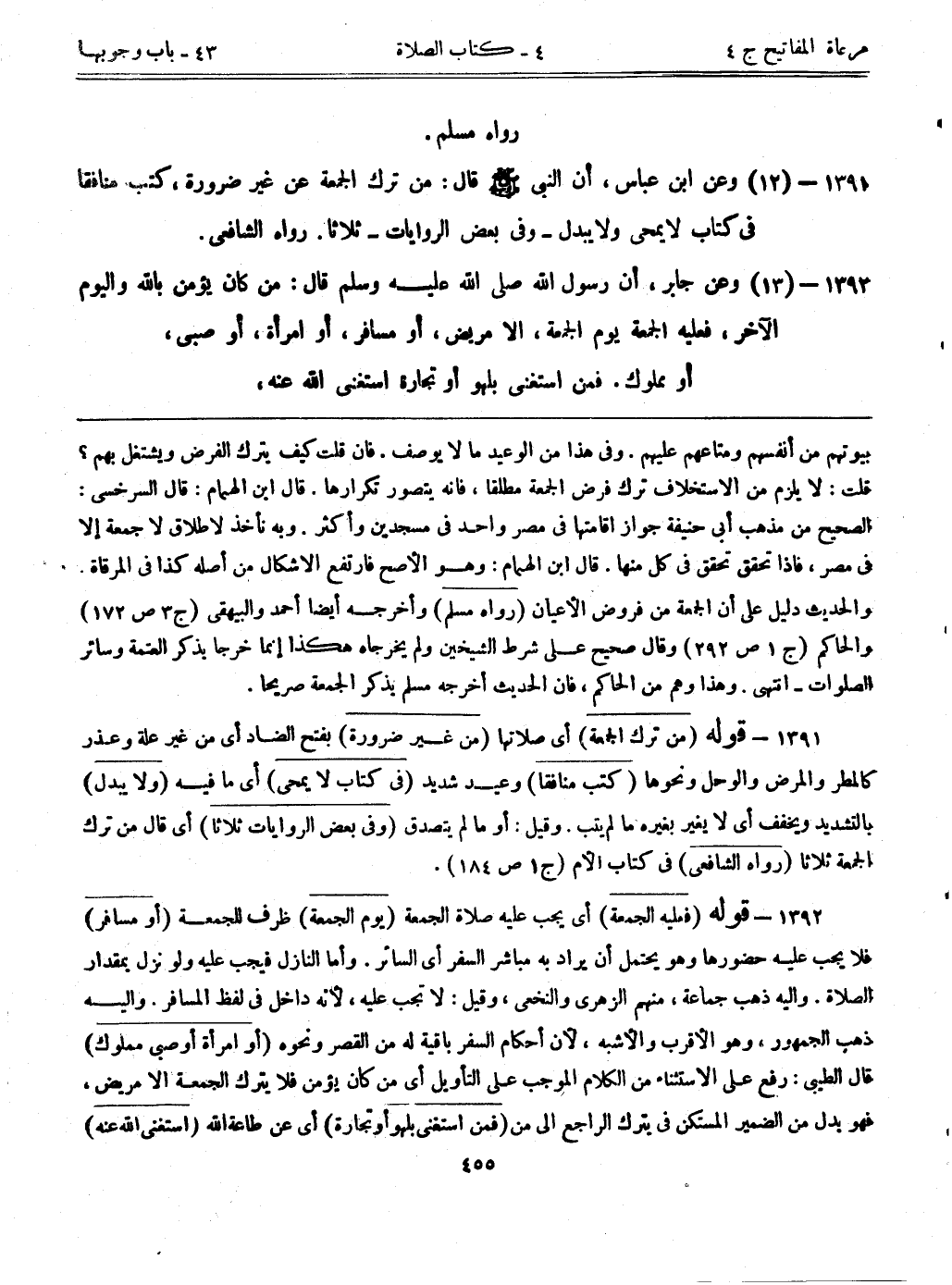 1392- قوله: (فعليه الجمعة) أي يجب عليه صلاة الجمعة. (يوم الجمعة) ظرف للجمعة. (أو مسافر) فلا يجب عليه حضورها، وهو يحتمل أن يراد به مباشر السفر أي السائر. وأما النازل فيجب عليه ولو نزل بمقدار الصلاة. وإليه ذهب جماعة، منهم الزهري والنخعي، وقيل: لا تجب عليه؛ لأنه داخل في لفظ المسافر. وإليه ذهب الجمهور، وهو الأقرب والأشبه؛ لأن أحكام السفر باقية له من القصر ونحوه. (أو امرأة أو صبي مملوك) قال الطيبي: رفع على الاستثناء من الكلام الموجب على التأويل، أي من كان يؤمن فلا يترك الجمعة إلا مريض، فهو بدل من الضمير المستكن في يترك الراجع إلى من. (فمن استغنى بلهو أو تجارة) أي عن طاعة الله. (استغنى الله عنه)