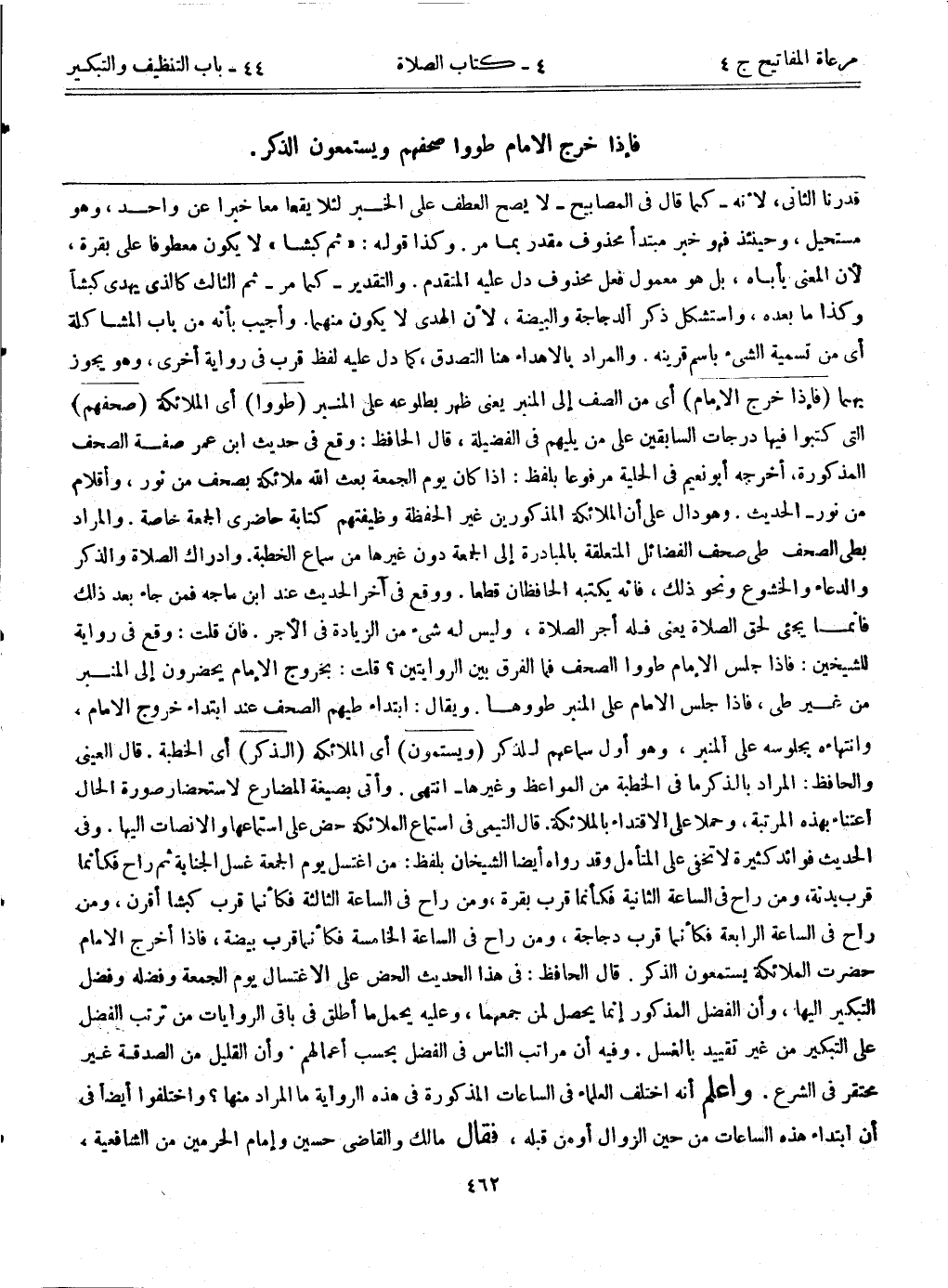 قدرنا الثاني، لأنه-كما قال في المصابيح-لا يصح العطف على الخبر لئلا يقعا معاً خبراً عن واحد، وهو مستحيل، وحينئذٍ فهو خبر مبتدأ محذوف مقدر بما مر. وكذا قوله: "ثم كبشاً" لا يكون معطوفاً على بقرة؛ لأن المعنى يأباه، بل هو معمول فعل محذوف دل عليه المتقدم. والتقدير-كما مر-، ثم الثالث كالذي يهدي كبشاً وكذا ما بعده، واستشكل ذكر الدجاجة والبيضة؛ لأن الهدي لا يكون منهما. وأجيب بأنه من باب المشاكلة أي من تسمية الشيء باسم قرينه. والمراد بالإهداء هنا التصدق، كما دل عليه لفظ: قرب في رواية أخرى وهو يجوز بهما. (فإذا خرج الإمام) أي من الصف إلى المنبر يعني ظهر بطلوعه على المنبر. (طووا) أي الملائكة (صحفهم) التي كتبوا فيها درجات السابقين على من يليهم في الفضيلة، قال الحافظ: وقع في حديث عمر صفة الصحف المذكورة، أخرجه أبونعيم في الحلية مرفوعاً بلفظ: إذا كان يوم الجمعة بعث الله ملائكة بصحف من نور، وأقلام من نور-الحديث. وهو دال على أن الملائكة المذكورين غير الحفظة، وظيفتهم كتابة حاضري الجمعة خاصة. والمراد بطي الصحف طي صحف الفضائل المتعلقة بالمبادرة إلى الجمعة دون غيرها من سماع الخطبة. وإدراك الصلاة والذكر والدعاء والخشوع ونحو ذلك، فإنه يكتبه الحافظان قطعاً. ووقع في آخر الحديث عند ابن ماجه فمن جاء بعد ذلك فإنما يجيء لحق الصلاة يعني فله أجر الصلاة، وليس له شيء من الزيادة في الأجر. فإن قلت: وقع في رواية للشيخين: فإذا جلس الإمام طووا الصحف فما الفرق بين الروايتين؟ قلت: بخروج الإمام يحضرون إلى المنبر من غير طي، فإذا جلس الإمام على المنبر طووها. ويقال: ابتداء طيهم الصحف عند ابتداء خروج الإمام، وانتهاؤه بجلوسه على المنبر، وهو أول سماعهم للذكر. (ويستمعون) أي الملائكة. (الذكر) أي الخطبة. قال العيني والحافظ: المراد بالذكر ما في الخطبة من المواعظ وغيرها-انتهى. وأتى بصيغة المضارع لاستحضار صورة الحال اعتناء بهذه المرتبة، وحملاً على الإقتداء بالملائكة. قال التيمي في استماع الملائكة حض على استماعها والإنصات إليها. وفي الحديث فوائد كثيرة لا تخفي على المتأمل. وقد رواه أيضاً الشيخان بلفظ: من اغتسل يوم الجمعة غسل الجنابة ثم راح فكأنما قرب بدنة، ومن راح في الساعة الثانية فكأنما قرب بقرة، ومن راح في الساعة الثالثة فكأنما قرب كبشاً أقرن، ومن راح في الساعة الرابعة فكأنما قرب دجاجة، ومن راح في الساعة الخامسة فكأنما قرب بيضة، فإذا أخرج الإمام حضرت الملائكة يستمعون الذكر. قال الحافظ: في هذا الحديث الحض على الإغتسال يوم الجمعة وفضله وفضل التبكير إليها، وأن الفضل المذكور إنما يحصل لمن جمعهما، وعليه ما أطلق في باقي الروايات من ترتب الفضل على التبكير من غير تقييد بالغسل. وفيه أن مراتب الناس في الفضل بحسب أعمالهم. وأن القليل من الصدقة غير محتقر في الشرع. واعلم أنه اختلف العلماء في الساعات المذكورة في هذه الرواية ما المراد منها؟ واختلفوا أيضاً في أن ابتداء هذه الساعات من حين الزوال أو من قبله، فقال مالك والقاضي حسين وإمام الحرمين من الشافعية،