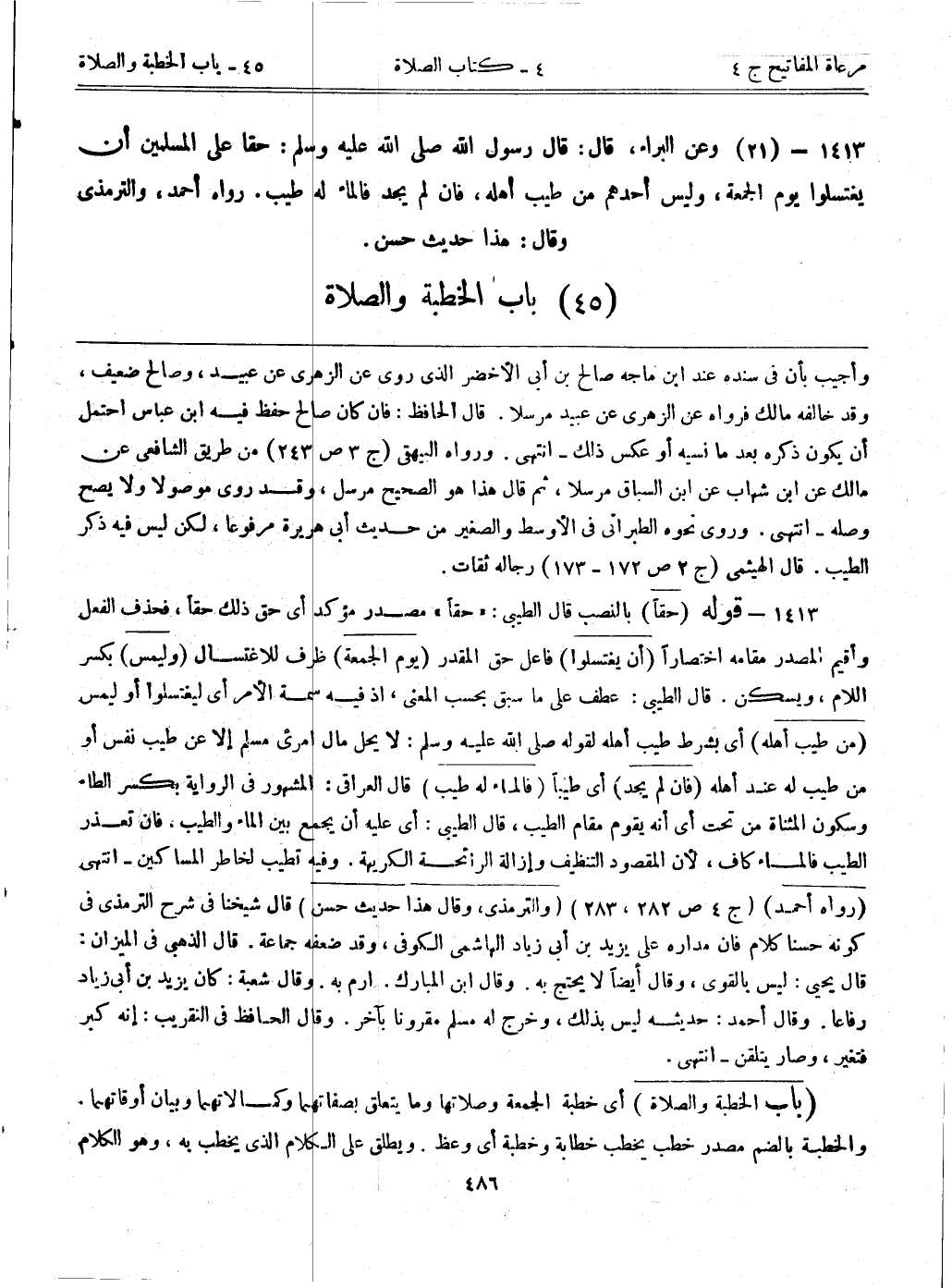 1413- (21) وعن البراء، قال: قال رسول الله صلى الله عليه وسلم: ((حقاً على المسلمين أن يغتسلوا يوم الجمعة، وليس أحدهم من طيب أهله، فإن لم يجد فالماء له طيب)) . رواه أحمد، والترمذي وقال: هذا حديث حسن.