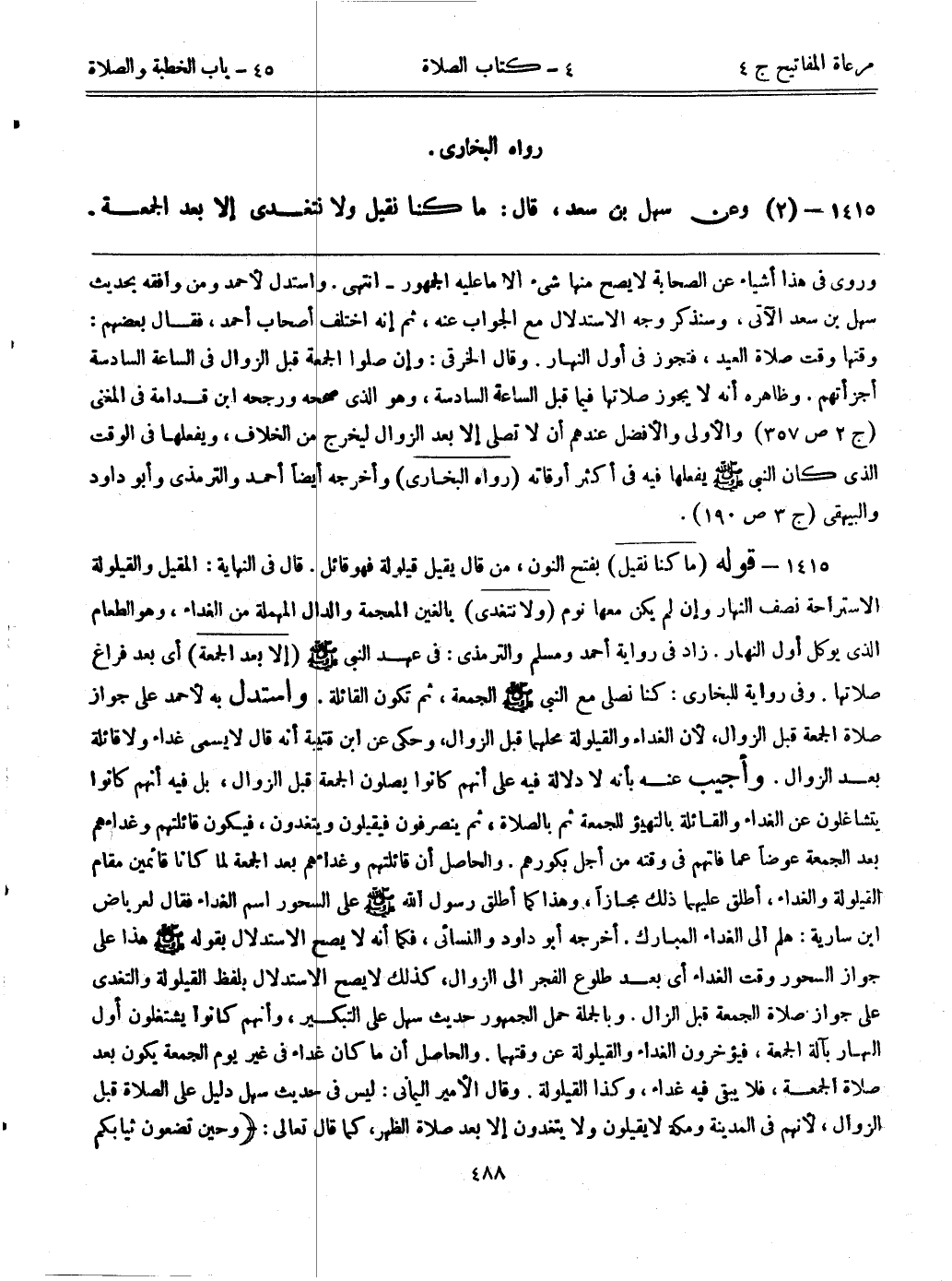 1415- (2) وعن سهل بن سعد، قال: ((ما كنا نقيل ولا نتغدى إلا بعد الجمعة)) .