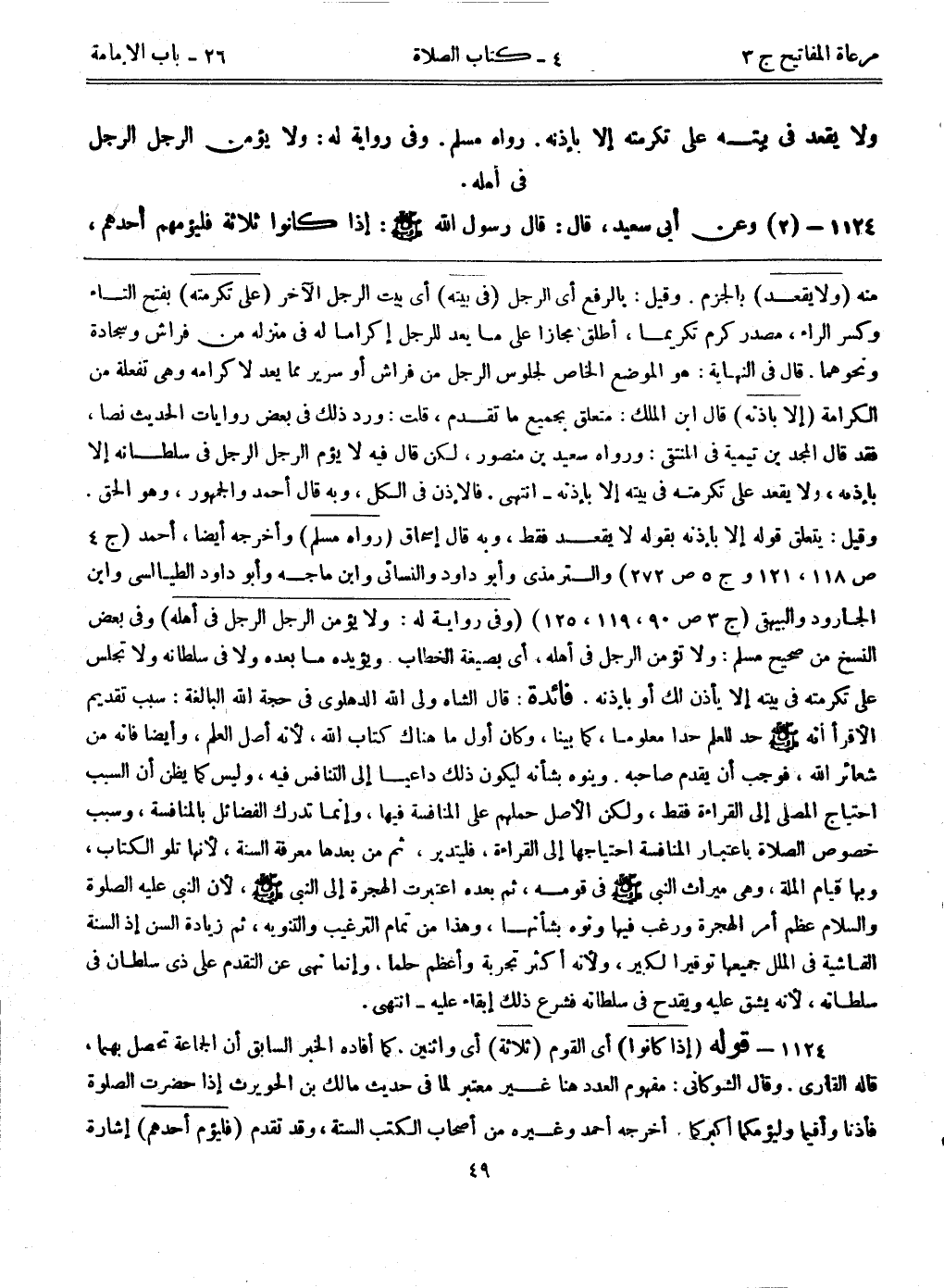 منه. (ولا يقعد) بالجزم. وقيل: بالرفع أي الرجل. (في بيته) أي بيت الرجل الآخر. (على تكرمته) بفتح التاء وكسر الراء، مصدر كرم تكريماً، أطلق مجازاً على ما يعد للرجل إكراماً له في منزله من فراش وسجادة ونحوهما. قال في النهاية: هو الموضع الخاص لجلوس الرجل من فراش أو سرير مما يعد لإكرامه، وهي تفعله من الكرامة. (إلا بإذنه) قال ابن الملك: متعلق بجميع ما تقدم: قلت: ورد ذلك في بعض روايات الحديث نصاً، فقد قال المجد بن تيمية في المنتقى: ورواه سعيد بن منصور، لكن قال فيه: لا يؤم الرجل الرجل في سلطانه إلا بإذنه، ولا يقعد على تكرمته في بيته إلا بإذنه- انتهى. فالإذن في الكل، وبه قال أحمد والجمهور، وهو الحق. وقيل: يتعلق قوله: إلا بإذنه بقوله: لا يقعد فقط، وبه قال إسحاق. (رواه مسلم) وأخرجه أيضاً، أحمد (ج4 ص118، 121وج5 ص272) والترمذي وأبوداود والنسائي وابن ماجه وأبوداود الطيالسي وابن الجارود والبيهقي (ج3 ص90، 119، 125) . (وفي رواية له: ولا يؤمن الرجل الرجل في أهله) وفي بعض النسخ من صحيح مسلم: ولا تؤمن الرجل في أهله، أي بصيغة الخطاب. ويؤيده ما بعده ولا في سلطانه ولا تجلس على تكرمته في بيته إلا بإذن لك أو بإذنه. فائدة: قال الشاه ولي الله الدهلوي في حجة الله البالغة: سبب تقديم الأقرأ أنه - صلى الله عليه وسلم - حد للعلم حداً معلوماً، كما بينا، وكان أول ما هناك كتاب الله؛ لأنه أصل العلم، وأيضاً فإنه من شعائر الله، فوجب أن يقدم صاحبه. وينوه بشأنه ليكون ذلك داعياً إلى التنافس فيه، وليس كما يظن أن السبب احتياج المصلى إلى القراءة فقط، ولكن الأصل حملهم على المنافسة فيها، وإنما تدرك الفضائل بالنافسة، وسبب خصوص الصلاة باعتبار المنافسة احتياجها إلى القراءة، فليتدبر، ثم من بعدها معرفة السنة؛ لأنها تلو الكتاب، وبها قيام الملة، وهي ميراث النبي - صلى الله عليه وسلم - في قومه، ثم بعده اعتبرت الهجرة إلى النبي - صلى الله عليه وسلم -؛ لأن النبي عليه الصلاة والسلام عظم أمر الهجرة ورغب فيها ونوه بشأنها، وهذا من تمام الترغيب والتنوية، ثم زيادة السن إذ السنة الفاشية في الملل جميعها توقير الكبير، ولأنه أكثر تجربة وأعظم حلماً، وإنما نهى عن التقدم على ذي سلطان في سلطانه؛ لأنه يشق عليه ويقدح في سلطانه فشرع ذلك إبقاء عليه- انتهى.