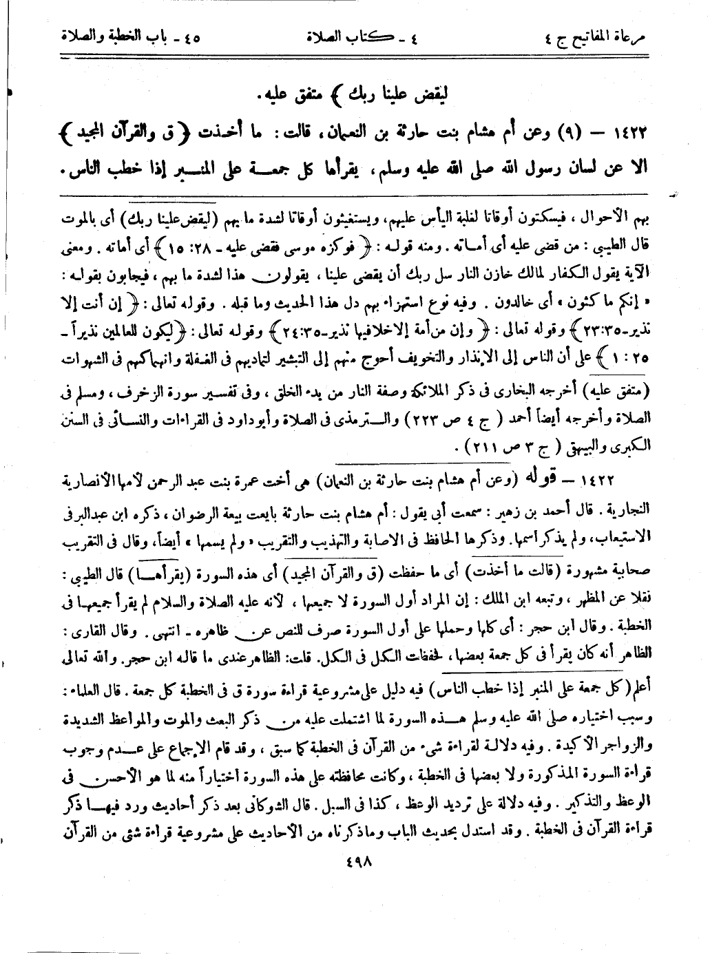 1422- قوله: (وعن أم هشام بنت حارثة النعمان) هي أخت عمرة بنت عبد الرحمن لأمها، الأنصارية النجارية. قال أحمد بن زهير: سمعت أبي يقول: أم هشام بنت حارثة بايعت بيعة الرضوان، ذكره ابن عبد البر في الاستيعاب، ولم يذكر اسمها. وذكرها الحافظ في الإصابة والتهذيب والتقريب "ولم يسمها" أيضاً، وقال في التقريب صحابية مشهورة. (قالت: ما أخذت) أي ما حفظت (ق والقرآن المجيد) أي هذه السورة. (يقرأها) قال الطيبي: نقلاً عن المظهر، وتبعه ابن الملك: إن المراد أول السورة لا جميعها؛ لأنه عليه الصلاة والسلام لم يقرأها جميعها في الخطبة. وقال ابن حجر: أي كلها وحملها على أول السورة صرف للنص عن ظاهره-انتهى. وقال القاري: الظاهر أنه كان يقرأ في كل جمعة بعضها، فحفظت الكل في الكل. قلت: الظاهر عندي ما قاله ابن حجر. والله تعالى أعلم. (كل جمعة على المنبر إذا خطب الناس) فيه دليل على مشروعية قراءة سورة ق في الخطبة كل جمعة. قال العلماء: وسبب اختياره صلى الله عليه وسلم هذه السورة لما اشتملت عليه من ذكر البعث والموت والمواعظ الشديدة والزواجر الأكيدة. وفيه دلالة لقراءة شيء من القرآن في الخطبة كما سبق، وقد قام الإجماع على عدم وجوب قراءة السورة المذكورة ولا بعضها في الخطبة، وكانت محافظته على هذه السورة اختيارا منه لما هو الأحسن في الوعظ والتذكير. وفيه دلالة على ترديد الوعظ، كذا في السبل. قال الشوكاني بعد ذكر أحاديث ورد فيها ذكر قراءة القرآن في الخطبة. وقد استدل بحديث الباب وما ذكرناه من الأحاديث على مشروعية قراءة شيء من القرآن