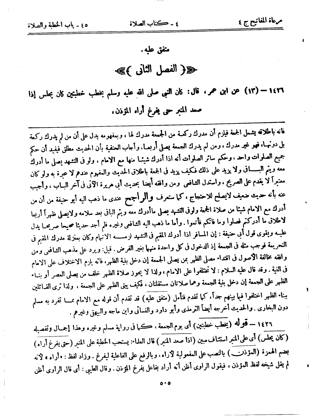 فإنه بإطلاقه يشمل الجمعة، فيلزم أن مدرك ركعة من الجمعة مدرك لها، وبمفهومه يدل على أن من لم يدرك ركعة بل دونها، فهو غير مدرك، ومن لم يدرك الجمعة يصلي أربعاً. وأجاب الحنفية بأن الحديث مطلق، فيفيد أن حكم جميع الصلوات واحد، وحكم سائر الصلوات أنه إذا أدرك شيئاً منها مع الإمام، ولو في التشهد يصلي ما أدرك معه ويتم الباقي ولا يزيد على ذلك، فكيف يزيد في الجمعة بإطلاق الحديث، والمفهوم عندهم لا عبرة به ولو كان معتبرا لا يقدم على الصريح، واستدل الشافعي ومن وافقه أيضاً بحديث أبي هريرة الآتي في آخر الباب، وأجيب عنه بأنه حديث ضعيف لا يصلح للاحتجاج، كما ستعرف. والراجح عندي ما ذهب إليه أبوحنيفة: من أن من أدرك مع الإمام شيئاً من صلاة الجمعة ولو في التشهد يصلي ما أدرك معه ويتم الباقي بعد سلامة ولا يصلي ظهراً أربعاً لإطلاق ما أدركتم فصلوا وما فاتكم فأتموا. وأما ما ذهب إليه الشافعي وغيره فلم أجد حديثاً صحيحاً صريحاً يدل عليه. ويقوي قول أبي حنيفة: إن المسافر إذا أدرك المقيم في التشهد لزمه الإتمام وكان بمنزلة مدرك المقيم في التحريمة فوجب مثله في الجمعة إذ الدخول في كل واحدة منهما بغير الفرض. قيل: ويرد على مذهب الشافعي ومن وافقه مخالفة الأصول في إقتداء مصلى الظهر بمن يصلي الجمعة إن دخل بنية الظهر، فإنه يلزم الاختلاف على الإمام في النية. وقد قال عليه السلام: لا تختلفوا على الإمام، ولذا لا يجوز صلاة الظهر خلف من يصلي العصر أو بناء الظهر على الجمعة إن دخل بنية الجمعة وهما صلاتان مستقلتان، فكيف يبني الظهر على الجمعة، ولذا ترى القائلين ببناء الظهر اختلفوا فيما بينهم جداً، كما تقدم فتأمل. (متفق عليه) قد تقدم أن قوله مع الإمام مما تفرد به مسلم دون البخاري. والحديث أخرجه أيضاً الترمذي وأبوداود والنسائي وابن ماجه والبيهقي وغيرهم.
