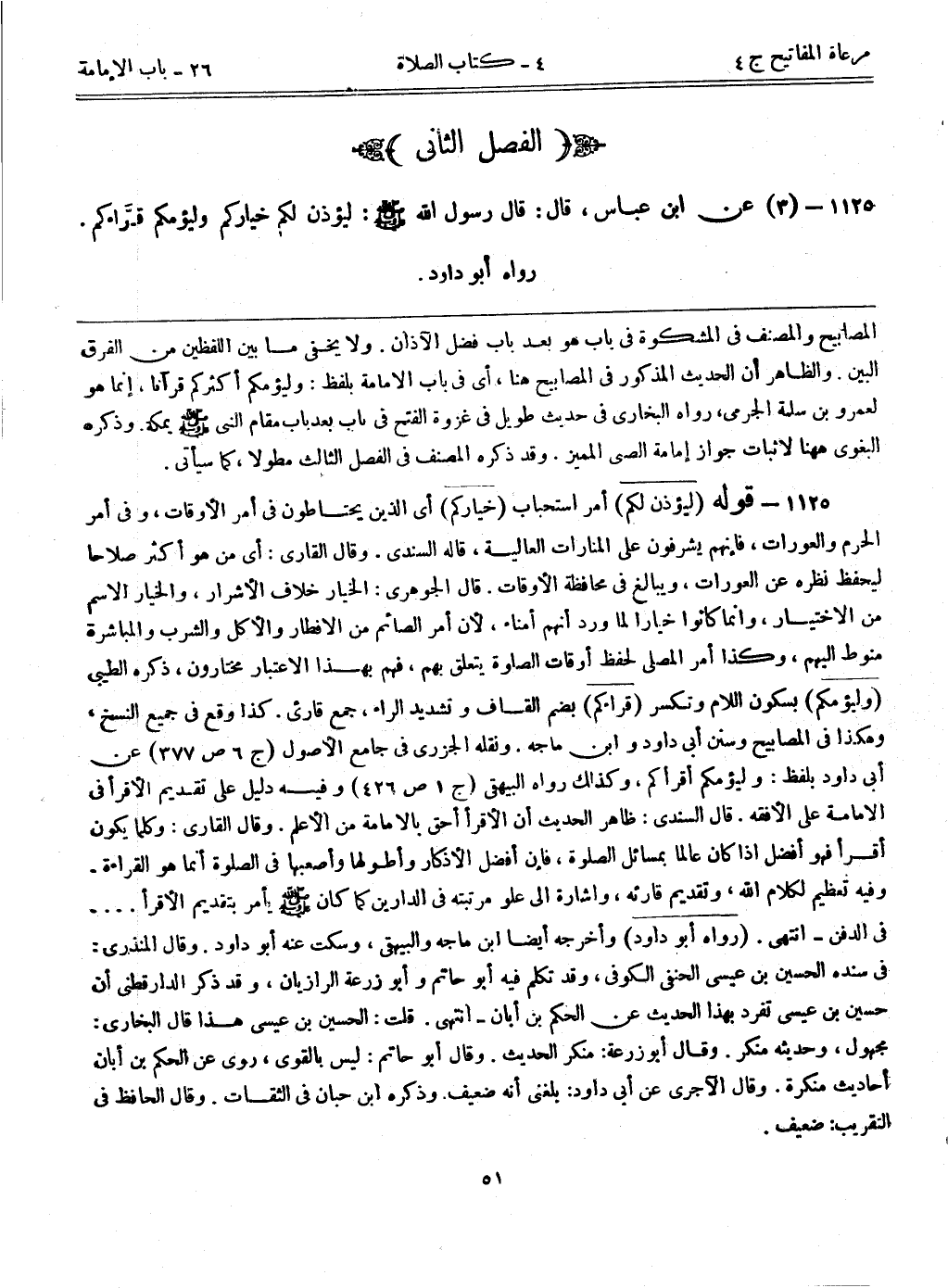 1125- (3) عن ابن عباس، قال: قال رسول الله - صلى الله عليه وسلم -: ((ليؤذن لكم خياركم وليؤمكم قراؤكم)) . رواه أبوداود.