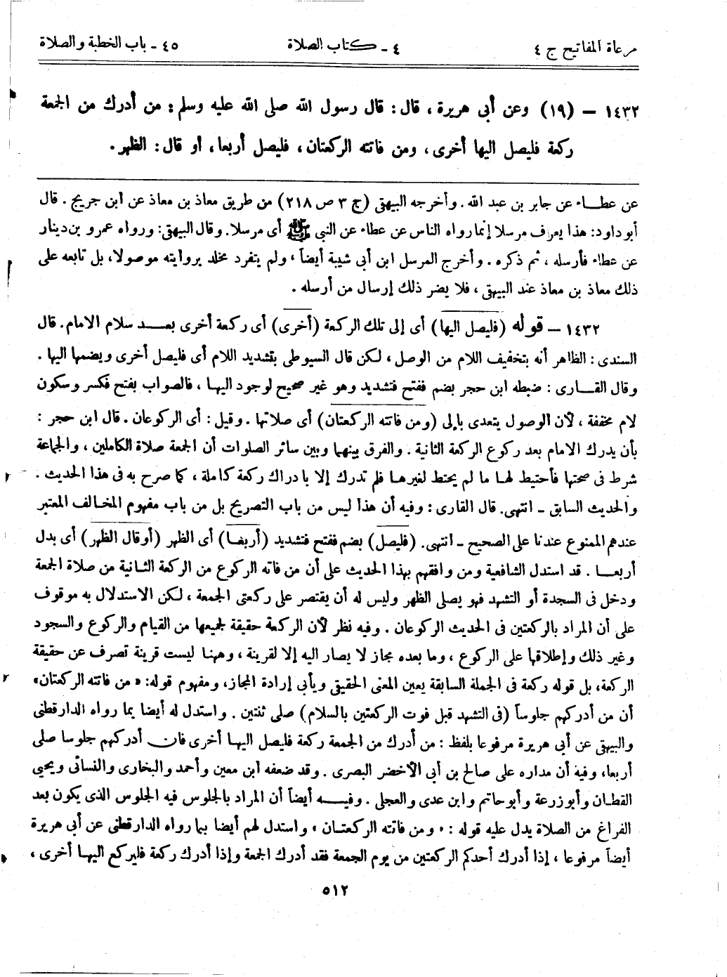 1432- (19) وعن أبي هريرة، قال: قال رسول الله صلى الله عليه وسلم: ((من أدرك من الجمعة