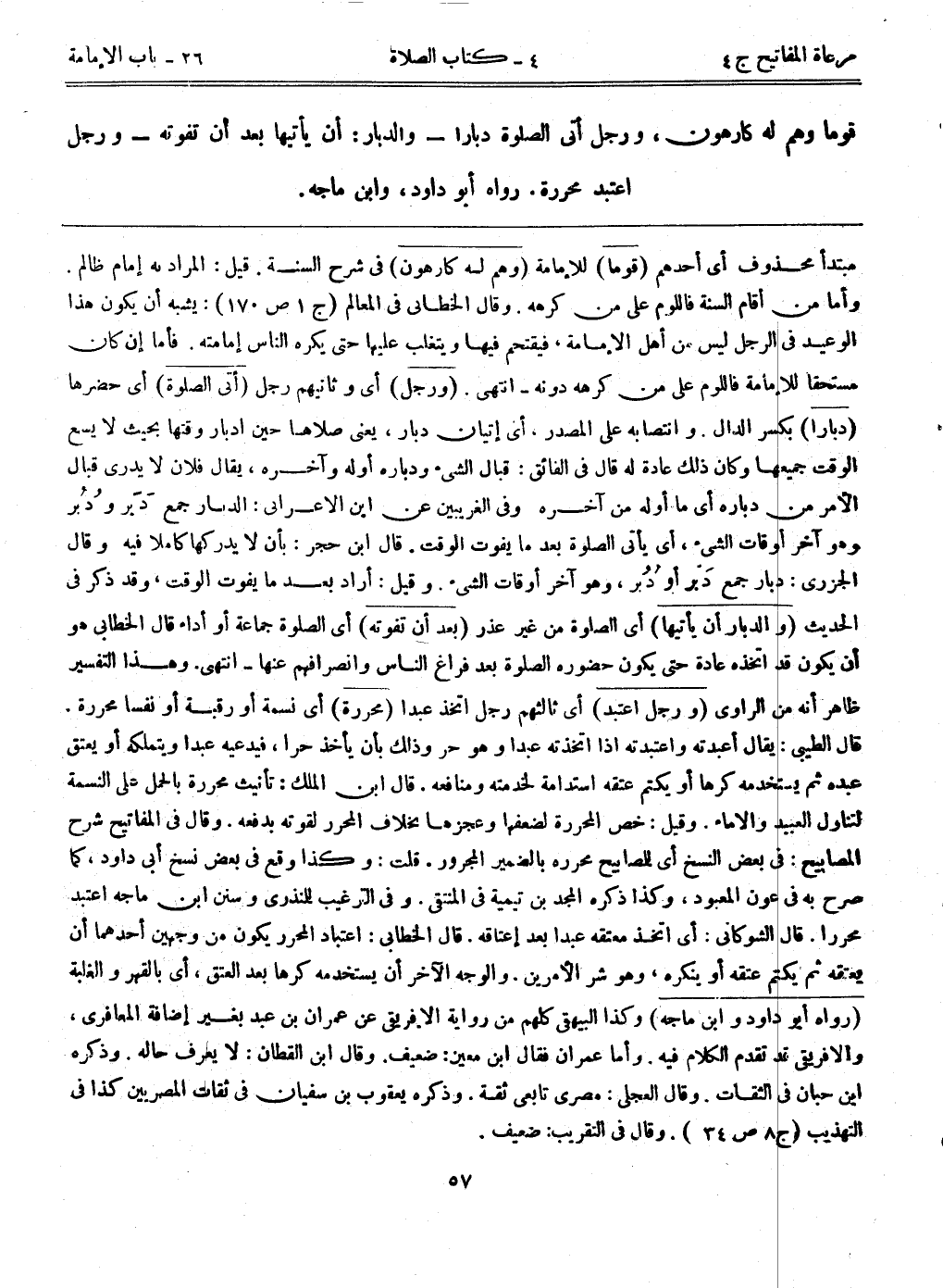 مبتدأ محذوف أي أحدهم. (قوماً) للإمامة. (وهم له كارهون) في شرح السنة. قيل: المراد به إمام ظالم. وأما من أقام السنة فاللوم على من كرهه. وقال الخطابي في المعالم (ج1 ص170) : يشبه أن يكون هذا الوعيد في الرجل ليس من أهل الإمامة، فيقتحم فيها ويتغلب عليها حتى يكره الناس إمامته. فأما إن كان مستحقاً للإمامة فاللوم على من كرهه دونه- انتهى. (ورجل) أي وثانيهم رجل. (أتى الصلاة) أي حضرها. (دباراً) بكسر الدال. وانتصابه على المصدر، أي إتيان دبار، يعني صلاها حين أدبار وقتها بحيث لا يسع الوقت جميعها، وكان ذلك عادة له قال في الفائق: قبال الشيء ودباره أوله وآخره، يقال: فلان لا يدري قبال الأمر من دباره، أي ما أوله من آخره، وفي الغربيين عن ابن الأعرابي: الدبار جمع دَبَر ودُبُر وهو آخر أوقات الشيء، أي يأتي الصلاة بعد ما يفوت الوقت. قال ابن حجر: بأن لا يدركها كاملاً فيه. وقال الجزري: دبار جمع دَبَر أو دُبُر، وهو آخر أوقات الشيء. وقيل: أراد بعد ما يفوت الوقت، وقد ذكر في الحديث. (والدبار أن يأتيها) أي الصلاة من غير عذر. (بعد أن تفوته) أي الصلاة جماعة أو أداء، قال الخطابي: هو أن يكون قد اتخذه عادة حتى يكون حضوره الصلاة بعد فراغ الناس وانصرافهم عنها- انتهى. وهذا التفسير ظاهر أنه من الراوي. (ورجل اعتبد) أي ثالثهم رجل اتخذ عبداً. (محررة) أي نسمة أو رقبة أو نفساً محررة. قال الطيبي: يقال أعبدته واعتبدته إذا اتخذته عبداً وهو حر، وذلك بأن يأخذ حراً، فيدعيه عبدا ويتملكه أو يعتق عبده ثم يستخدمه كرهاً أو يكتم عتقه استدامة لخدمته ومنافعه. قال ابن الملك: تأنيث محررة بالحمل على النسمة لتناول العبيد والإماء. وقيل: خص المحررة لضعفها وعجزها بخلاف المحرر لقوته بدفعه. وقال في المفاتيح شرح المصابيح: في بعض النسخ أي للمصابيح محررة بالضمير المجرور. قلت: وكذا وقع في بعض نسخ أبي داود، كما صرح به في عون المعبود، وكذا ذكره المجد بن تيمية في المنتقى. وفي الترغيب للمنذري وسنن ابن ماجه: اعتبد محرراً. قال الشوكاني: أي اتخذ معتقه عبداً بعد إعتاقه. قال الخطابي: اعتباد المحرر يكون من وجهين: أحدهما أن يعتقه ثم يكتم عتقه أو ينكره، وهو شر الأمرين. والوجه الآخر أن يستخدمه كرهاً بعد العتق، أي بالقهر والغلبة. (رواه أبوداود وابن ماجه) وكذا البيهقي كلهم من رواية الإفريقي عن عمران بن عبد بغير إضافة المعافري، والافريقي قد تقدم الكلام فيه. وأما عمران فقال ابن معين: ضعيف. وقال ابن القطان: لا يعرف حاله. وذكره ابن حبان في الثقات. وقال العجلي: مصري تابعي ثقة. وذكره يعقوب بن سفيان في ثقات المصريين كذا في التهذيب (ج8 ص34) . وقال في التقريب: ضعيف.