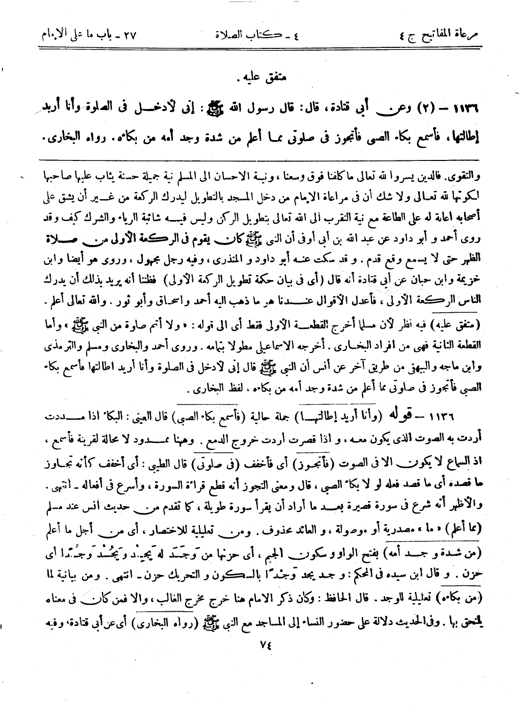 1136- قوله: (وأنا أريد إطالتها) جملة حالية. (فأسمع بكاء الصبي) قال العيني: البكاء إذا مددت أردت به الصوت الذي يكون معه، وإذا قصرت أردت خروج الدمع. وههنا ممدود لا محالة لقرينة فأسمع، إذ السماع لا يكون إلا في الصوت. (فأتجوز) أي فأخفف. (في صلاتي) قال الطيبي: أي أخفف كأنه تجاوز ما قصده أي ما قصد فعله لولا بكاء الصبي، قال: ومعنى التجوز أنه قطع قراءة السورة، وأسرع في أفعاله- انتهى. والأظهر أنه شرع في سورة قصيرة بعد ما أراد أن يقرأ سورة طويلة، كما تقدم من حديث أنس عند مسلم. (مما أعلم) "ما" مصدرية أو موصولة، والعائد محذوف. ومن تعليليه للاختصار، أي من أجل ما أعلم. (من شدة وجد أمه) بفتح الواو وسون الجيم، أي حزنها من وجد له يجد ويجد وجداً أي حزن. وقال ابن سيدة في المحكم: وجد يجد وجداً بالسكون والتحريك حزن- انتهى. ومن بيانية لما. (من بكاءه) تعليلية للوجد. قال الحافظ: وكان ذكر الإمام هنا خرج مخرج الغالب، وإلا فمن كان في معناه يلتحق بها. وفي الحديث دلالة على حضور النساء إلى المساجد مع النبي - صلى الله عليه وسلم -. (رواه البخاري) أي عن أبي قتادة، وفيه