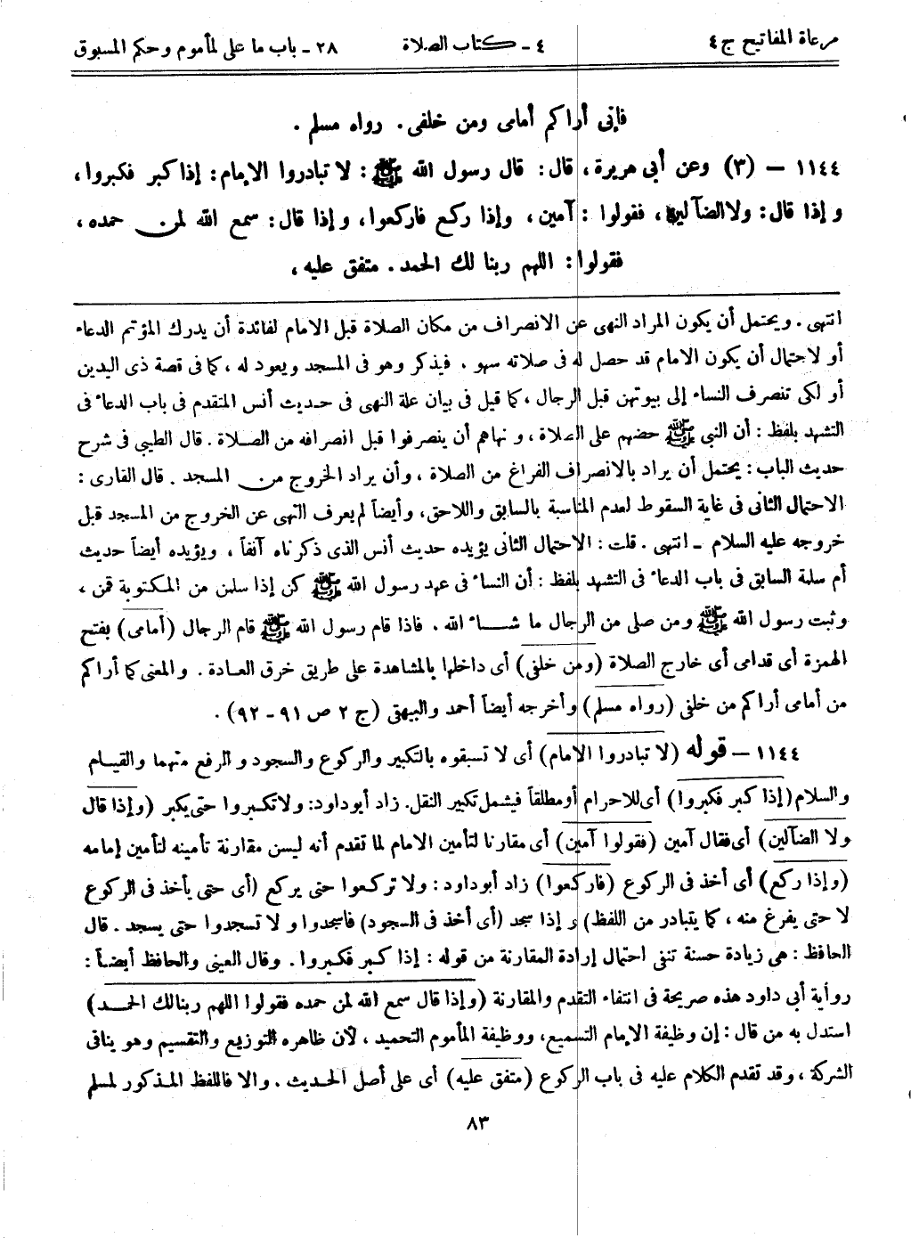 1144- (3) وعن أبي هريرة، قال: قال رسول الله - صلى الله عليه وسلم -: ((لا تبادروا الإمام: إذا كبر فكبروا، وإذا