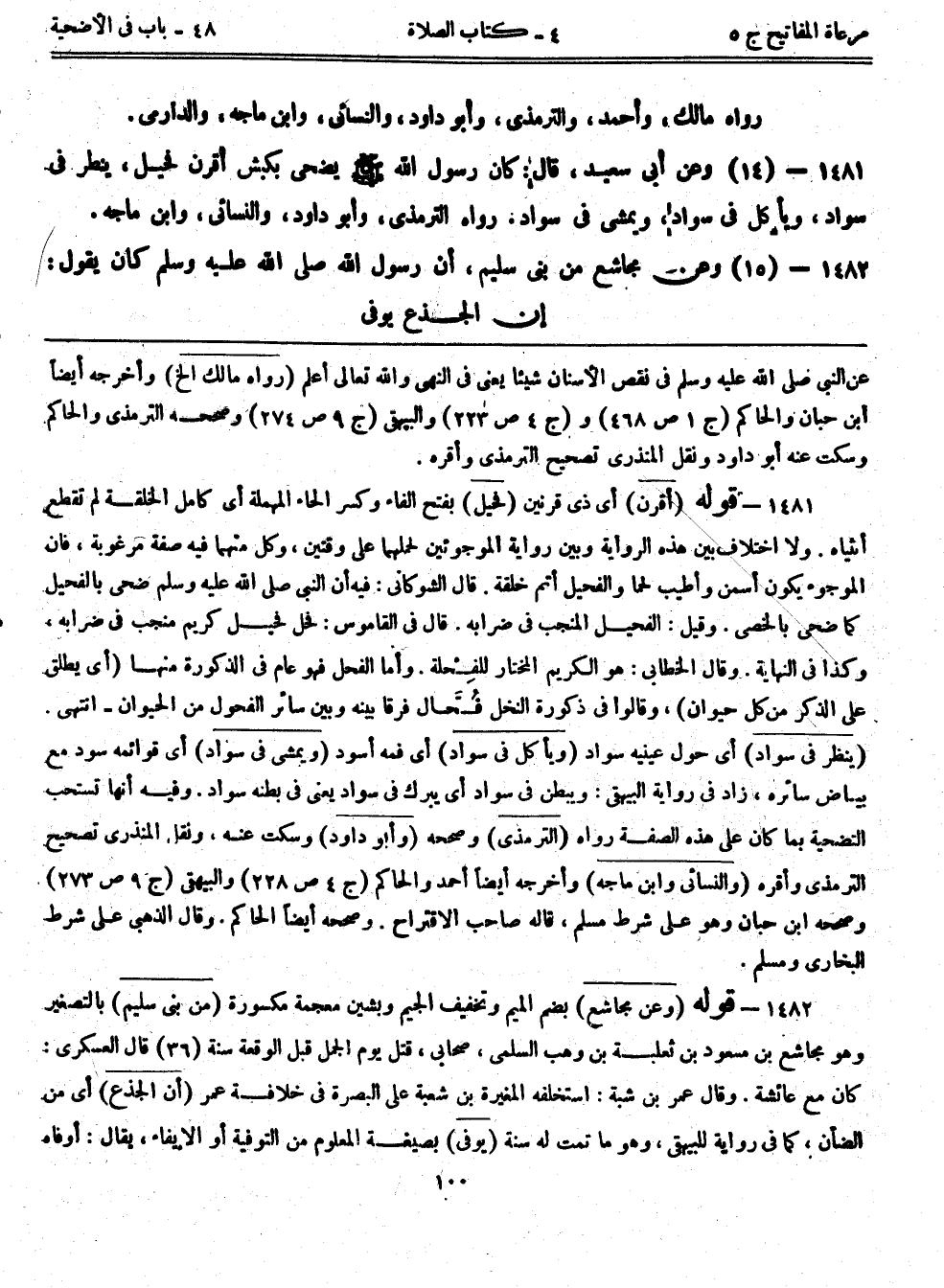 1481- (14) وعن أبي سعيد قال: كان رسول الله - صلى الله عليه وسلم - يضحي بكبش أقرن فحيل، ينظر في سواد، ويأكل في سواد، ويمشي في سواد، رواه الترمذي، وأبوداود، والنسائي، وابن ماجه.