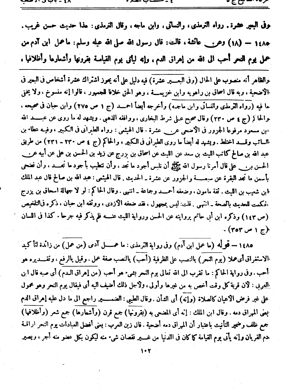 1485- (18) وعن عائشة قالت: قال رسول الله - صلى الله عليه وسلم -: ((ما عمل ابن آدم من عمل يوم النحر أحب إلى الله من إهراق الدم، وإنه ليأتي يوم القيامة بقرونها وأشعارها وأظلافها،
