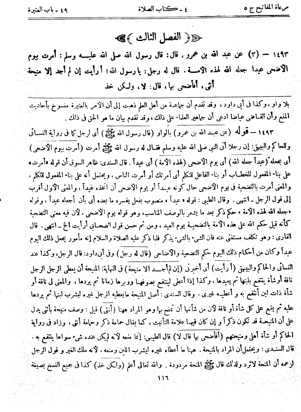 1493- (3) عن عبد الله بن عمرو قال: قال رسول الله - صلى الله عليه وسلم -: ((أمرت بيوم الأضحى عيداً جعله الله لهذه الأمة، قال له رجل: يا رسول الله! أرأيت إن لم أجد إلا منيحة أنثى، أفأضحي بها؟ قال: لا، ولكن خذ