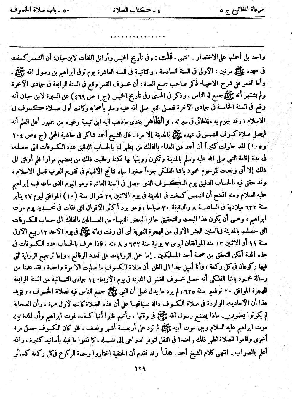 واحد، بل أحملها على الاختصار – انتهى. قلت: وفي تاريخ الخميس وأوائل الثقات لابن حبان: أن الشمس كسفت في عهده - صلى الله عليه وسلم - مرتين: الأولى في السنة السادسة، والثانية في السنة العاشرة يوم توفي إبراهيم بن رسول الله - صلى الله عليه وسلم -، وأما القمر ففي شرح الإحياء ذكر صاحب جمع العدة: أن خسوف القمر وقع في السنة الرابعة في جمادى الآخرة ولم يشتهر أنه - صلى الله عليه وسلم - جمع له الناس، وذكر في الهدي وفي تاريخ الخميس (ج1 ص469) عن السيرة لابن حبان أنه وقع في السنة الخامسة في جمادى الآخرة، فصلى النبي - صلى الله عليه وسلم - بأصحابه، وكانت أول صلاة كسوف في الإسلام، وقد جزم به مغلطائي في سيرته. والظاهر عندي ما ذهب إليه ابن تيمية وغيره من جمهور أهل العلم أنه لم يصلي صلاة كسوف الشمس في عهده - صلى الله عليه وسلم - بالمدينة إلا مرة. قال الشيخ أحمد شاكر في حاشية المحلى (ج5 ص104، 105) : لقد حاولت كثيراً أن أجد من العلماء بالفلك من يظهر لنا بالحساب الدقيق عدد الكسوفات التي حصلت في مدة إقامة النبي - صلى الله عليه وسلم - بالمدينة، وتكون ؤيتها بها ممكنة، وطلبت ذلك من بعضهم مراراً، فلم أوفق إلى ذلك، إلا أني وجدت للمرحوم محمود باشا الفلكي جزءاً صغيراً سماه نتائج الأفهام في تقويم العرب قبل الإسلام، وقد حقق فيه بالحساب الدقيق يوم الكسوف الذي حصل فيه السنة العاشرة، وهو اليوم الذي مات فيه إبراهيم – عليه السلام -، ومنه اتضح أن الشمس كسفت في المدينة في يوم الاثنين 29 شوال سنة (10) ، الموافق ليوم 27 يناير سنة 632 ميلادية في الساعة 8 والدقيقة 30 صباحاً، وهو يرد أكثر الأقوال التي نقلت في تحديد يوم موت إبراهيم، وعسى أن يكون هذا البحث والتحقيق حافزاً لبعض النبهاء من العالمين بالفلك إلى حساب الكسوفات الي حصلت بالمدينة في السنين العشر الأولى من الهجرة النبوية، أي إلى وقت وفاته - صلى الله عليه وسلم - في يوم الأحد 12 ربيع الأول سنة 11 أو الاثنين 13 منه الموافقان ليومي 7 يونية سنة 632 و8 منه، فإذا عرف بالحساب عدد الكسوفات في هذه المدة أمكن التحقيق من صحة أحد المسلكين. إما حمل الروايات على تعدد الوقائع، وإما ترجيح الرواية التي فيها ركوعان في كل ركعة، وأنا أميل جداً إلى الظن بأن صلاة الكسوف ما صليت إلا مرة واحدة، فقد علمنا من رسالة محمود باشا الفلكي أنه حصل خسوف للقمر في المدينة في يوم الأربعاء 14 جمادى الثانية من السنة الرابعة للهجرة الموافق 20 نوفمبر سنة 625، ولم يرد ما يدل على أن النبي - صلى الله عليه وسلم - جمع الناس فيه لصلاة الخسوف، ويؤيد هذا أن الأحاديث الواردة في صلاة الكسوف دالة بسياقها على أن هذه الصلاة كانت لأول مرة، وأن الصحابة لم يكونوا يعلمون ماذا يصنع رسول الله - صلى الله عليه وسلم - في وقتها، وأنهم ظنوا أنها كسفت لموت إبراهيم، وأن المدة بين موت إبراهيم – عليه السلام – وبين موت أبيه - صلى الله عليه وسلم - لم تزد على أربعة أشهر ونصف، فلو كان الكسوف حصل مرة أخرى وقاموا للصلاة لظهر ذلك واضحاً في النقل لتوفر الدواعي إلى نقله، كما نقلوا ما قبله بأسانيد كثيرة، والله أعلم بالصواب – انتهى كلام الشيخ أحمد. هذا وقد تقدم أن الحنفية اختاروا وحدة الركوع في كل ركعة كسائر