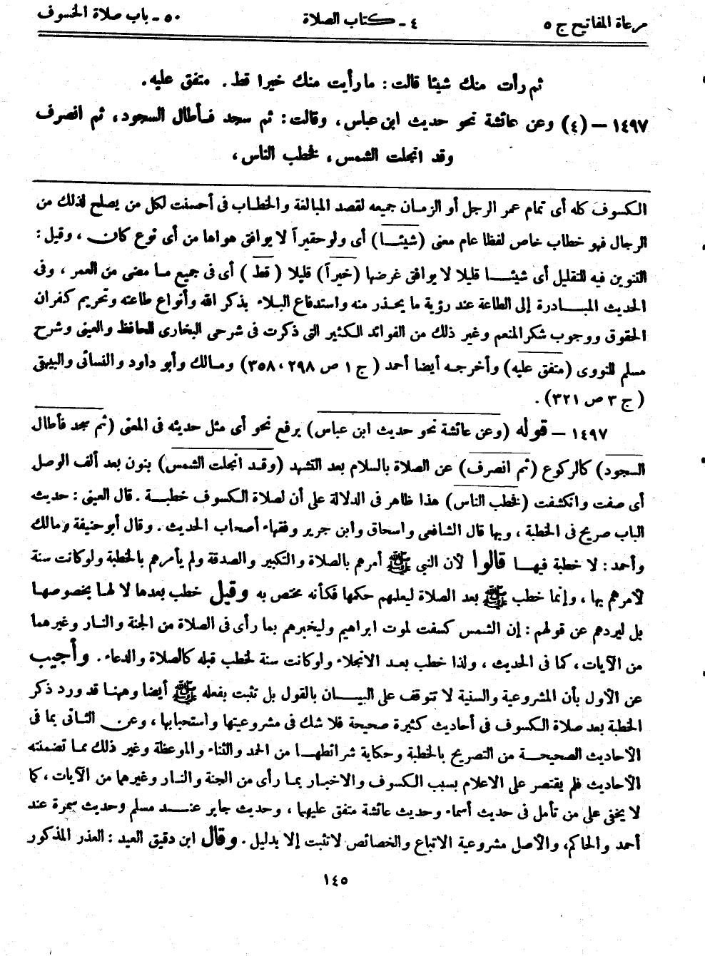 1497- (4) وعن عائشة نحو حديث ابن عباس، وقالت: ثم سجد فأطال السجود، ثم انصرف وقد انجلت الشمس، فخطب الناس،