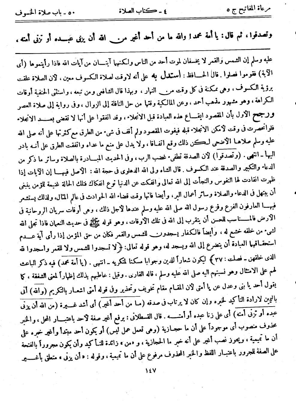 إن الشمس والقمر لا يخسفان لموت أحد من الناس ولكنهما آيتان من آيات الله، فإذا رأيتموها (أي الآية) فقوموا فصلوا، قال الحافظ: استدل به على أنه لا وقت لصلاة الكسوف معين؛ لأن الصلاة علقت برؤية الكسوف، وهي ممكنة في كل وقت من النهار، وبهذا قال الشافعي ومن تبعه، واستثنى الحنفية أوقات الكراهة، وهو مشهور مذهب أحمد، وعن المالكية وقتها من حل النافلة إلى الزوال، وفي رواية إلى صلاة العصر. ورجح الأول بأن المقصود إيقاع هذه العبادة قبل الانجلاء، وقد اتفقوا على أنها لا تقضى بعد الانجلاء، فلو انحصرت في وقت لأمكن الانجلاء قبله فيفوت المقصود، ولم أقف في شيء من الطرق مع كثرتها على أنه - صلى الله عليه وسلم - صلاها الأضحى لكن ذلك وقع اتفاقاً، ولا يدل على منع ما عداه، واتفقت الطرق على أنه بادر إليها – انتهى. (وتصدقوا) لأن الصدقة تطفئ غضب الرب، وفي الحديث المبادرة بالصلاة وسائر ما ذكر من الدعاء والتكبير والصدقة عند الكسوف، قال الشاه ولي الله الدهلوي في حجة الله: الأصل فيها إن الآيات إذا ظهرت انقادت لها النفوس والتجأت إلى الله تعالى وانفكت عن الدنيا نوع انفكاك، فتلك الحالة غنيمة للمؤمن ينبغي أن يبتهل في الدعاء والصلاة وسائر أعمال البر، وأيضاً فإنها وقت قضاء الله الحوادث في عالم المثال، ولذلك يستشعر فيها العارفون الفزع وفزع رسول الله - صلى الله عليه وسلم - عندها لأجل ذلك، وهي أوقات سريان الروحانية في الأرض، فالمناسب للمحسن أن يتقرب إلى الله في تلك الأوقات، وهو قوله - صلى الله عليه وسلم - في حديث النعمان: ((فإذا تجلى الله لشيء من خلقه خشع له)) ، وأيضاً فالكفار يسجدون للشمس والقمر فكان من حق المؤمن إذا رأى آية عدم استحقاقهما العبادة أن يتضرع إلى الله ويسجد له، وهو قوله تعالى: {لا تسجدوا للشمس ولا للقمر واسجدوا لله الذي خلقهن} [فصلت: 37] ليكون شعاراً للدين وجواباً مسكتاً لمنكريه – انتهى. (يا أمة محمد) فيه ذكر الباعث لهم على الامتثال وهو نسبتهم إليه - صلى الله عليه وسلم -، قاله القاري، وقيل: خاطبهم بذلك إظهاراً لمعنى الشفقة، كما يقول أحد: يا بني، وعدل عن يا أمتي لأن المقام مقام تخويف وتحذير، وفي قوله: ((أمتي)) إشعار بالتكريم (والله) أتى باليمين لإرادة التأكيد لخبره، وإن كان لا يرتاب في صدقه (ما من أحد أغير) أي أشد غيرة (من الله أن يزني عبده أو تزني أمته) أي على زنا عبده أو أمته، قال القسطلاني: برفع أغير صفة لأحد باعتبار المحل، والخبر محذوف منصوب أي موجوداً على أن ما حجازية – وهي تعمل عمل ليس -، أو يكون أحد مبتدأ وأغير خبره على أن ما تميمية، ويجوز نصب أغير على أنه خبر ما الحجازية، و"من" زائدة للتأكيد وأن يكون مجروراً بالفتحة على الصفحة للمجرور باعتبار اللفظ والخبر المحذوف مرفوع على أن ما تميمية، وقوله ((أن يزني)) متعلق بأغير