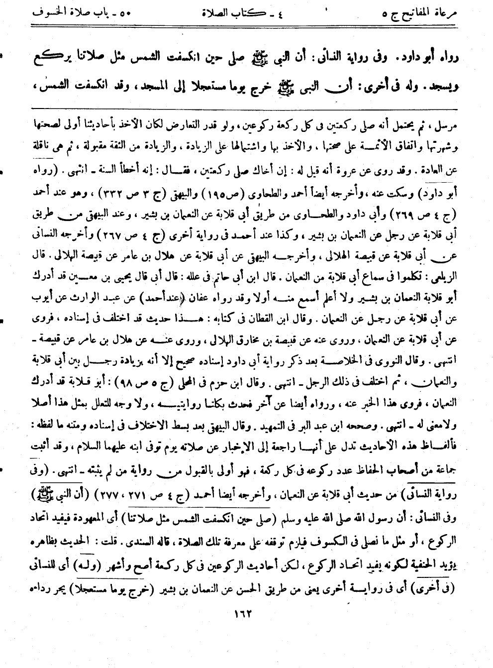 مرسل، ثم يحتمل أنه صلى ركعتين في كل ركعة ركوعين، ولو قدر التعارض لكان الأخذ بأحاديثنا أولى لصحتها وشهرتها واتفاق الأئمة على صحتها، والأخذ بها واشتمالها على الزيادة، والزيادة من الثقة مقبولة، ثم هي نافلة عن العادة، وقد روي عن عروة أنه قيل له: إن أخاك صلى ركعتين، فقال: إنه أخطأ السنة – انتهى. (رواه أبوداود) وسكت عنه، وأخرجه أيضاً وأحمد والطحاوي (ص195) والبيهقي (ج3 ص332) ، وهو عند أحمد (ج4 ص269) وأبي داود والطحاوي من طريق أبي قلابة عن النعمان بن بشير، وعند البيهقي من طريق أبي قلابة عن رجل عن النعمان بن بشير، وكذا عند أحمد في رواية أخرى (ج4 ص267) وأخرجه النسائي عن أبي قلابة عن قبيصة الهلالي، وأخرجه البيهقي عن أبي قلابة عن هلال بن عامر عن قبيصة الهلالي، قال الزيلعي: تكلموا في سماع أبي قلابة من النعمان، قال ابن أبي حاتم في علله: قال أبي: قال يحيى بن معين: قد أدرك أبوقلابة النعمان بن بشير ولا أعلم أسمع منه أو لا؟ وقد رواه عفان – عند أحمد – عن عبد الوارث عن أيوب عن أبي قلابة عن النعمان، وروي عنه عن قبيصة بن مخارق الهلالي، وروي عنه عن هلال بن عامر عن قبيصة – انتهى. وقال النووي في الخلاصة بعد ذكر رواية أبي داود: إسناده صحيح، إلا أنه بزيادة رجل بين أبي قلابة والنعمان، ثم اختلف في ذلك الرجل – انتهى. وقال ابن حزم في المحلى (ج5 ص98) : أبوقلابة قد أدرك النعمان، فروى هذا الخبر عنه، ورواه أيضاً عن آخر فحدث بكلنا روايتيه، ولا وجه للتعلل بمثل هذا أصلاً ولا معنى له – انتهى. وصححه ابن عبد البر في التمهيد، وقال البيهقي بعد بسط الاختلاف في إسناده ومتنه ما لفظه: فألفاظ هذه الأحاديث تدل على أنها راجعة إلى الإخبار عن صلاته يوم توفي ابنه – عليهما السلام -، وقد أثبت جماعة من أصحاب الحفاظ عدد ركوعه في كل ركعة، فهو أولى بالقبول من رواية من لم يثبته – انتهى. (وفي رواية النسائي) من حديث أبي قلابة عن النعمان، وأخرجه أيضاً أحمد (ج4 ص271، 277) . (أن النبي - صلى الله عليه وسلم -) وفي النسائي: أن رسول الله - صلى الله عليه وسلم - (صلى حين انكسفت الشمس مثل صلاتنا) أي المعهودة فيفيد اتحاد الركوع، أو مثل ما نصلي في الكسوف فيلزم توقفه على معرفة تلك الصلاة، قاله السندي، قلت: الحديث بظاهره يؤيد الحنفية لكونه يفيد اتحاد الركوع، لكن أحاديث الركوعين في كل ركعة أصح وأشهر (وله) أي للنسائي (في أخرى) أي في رواية أخرى يعني من طريق الحسن عن النعمان عن النعمان بن بشير (خرج يوماً مستعجلاً) يجر رداءه