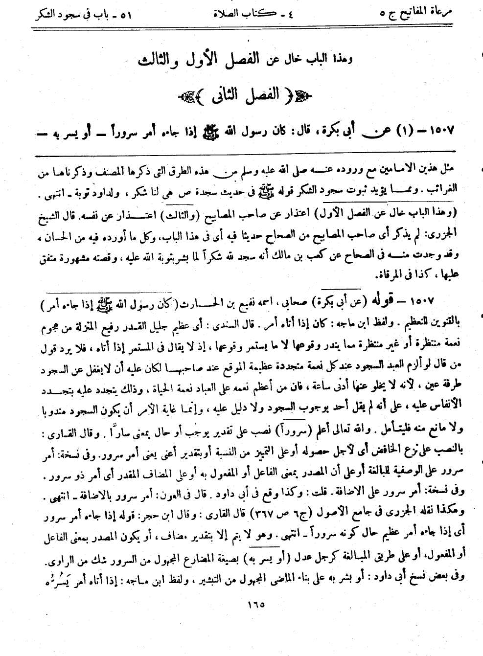 (1507) - قوله (عن أبي بكرة) صحابي، اسمه نفيع بن الحارث (كان رسول الله - صلى الله عليه وسلم - إذا جاء أمر) بالتنوين للتعظيم، ولفظ ابن ماجه: ((كان إذا أتاه أمر)) ، قال السندي: أي عظيم جليل القدر رفيع المنزلة من هجوم نعمة منتظرة أو غير منتظرة مما يندر وقوعها لا ما يستمر وقوعها، إذ لا يقال في المستمر: إذا أتاه، فلا يرد قول من قال: لو ألزم العبد السجود عند كل نعمة متجددة عظيمة الموقع عند صاحبها لكان عليه أن لا يغفل عن السجود طرفة عين؛ لأنه لا يخلو عنها أدنى ساعة، فإن من أعظم نعمه على العباد نعمة الحياة، وذلك يتجدد عليه بتجدد الأنفاس عليه، على أنه لم يقل أحد بوجوب السجود ولا دليل عليه، وإنما غاية الأمر أن يكون السجود مندوباً، ولا مانع منه، فليتأمل. والله تعالى أعلم. (سروراً) نصب على تقدير يوجب أو حال بمعنى سارّاً، وقال القاري: بالنصب على نزع الخافض، أي لأجل حصوله أو على التمييز من النسبة أو بتقدير أعني يعني أمر سرور، وفي نسخة: أمر سرور على الوصفية للمبالغة أو على أن المصدر بمعنى الفاعل أو المفعول به أو على المضاف المقدر أي أمر ذو سرور، وفي نسخة: أمر سرور على الإضافة. قلت: وكذا وقع في أبي داود، قال في العون: أمر سرور بالإضافة - انتهى. وهكذا نقله الجزري في جامع الأصول (ج6 ص367) ، قال القاري: وقال ابن حجر: قوله ((إذا جاءه أمر سرور)) أي إذا جاءه أمر عظيم حال كونه سروراً - انتهى. وهو لا يتم إلا بتقدير مضاف، أو يكون المصدر بمعنى الفاعل أو المفعول، أو على طريق المبالغة كرجل عدل (أو يسر به) بصيغة المضارع المجهول من السرور شك من الراوي، وفي بعض نسخ أبي داود: ((أو بشر به)) على بناء الماضي المجهول من التبشير، ولفظ ابن ماجه: ((إذا أتاه أمر يَسُرُّه