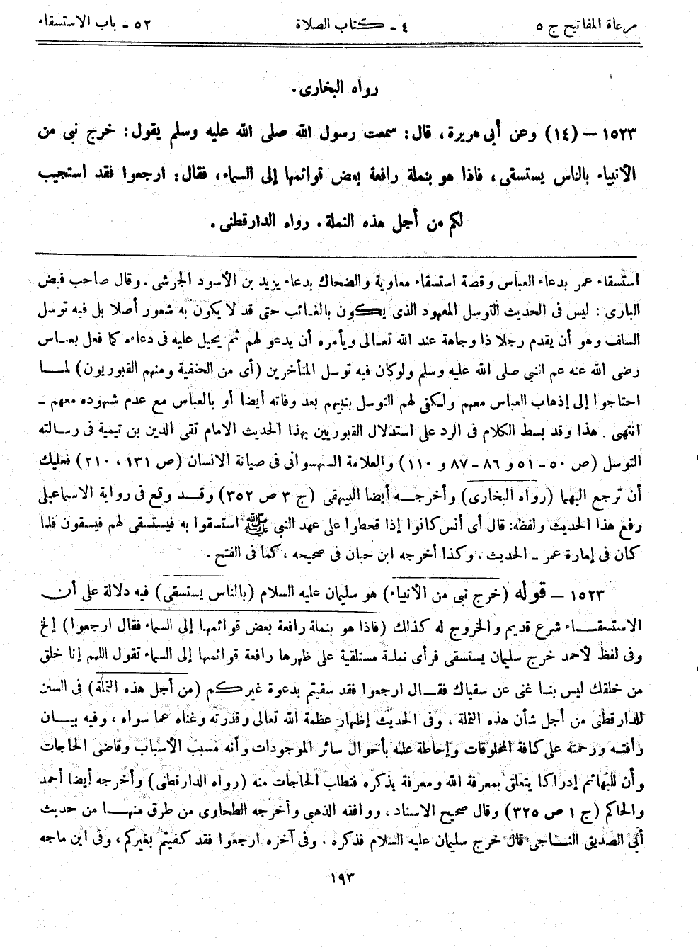 1523- (14) وعن أبي هريرة، قال سمعت رسول الله - صلى الله عليه وسلم - يقول: ((خرج نبي من الأنبياء بالناس يستسقى، فإذا هو بنملة رافعة بعض قوائمها إلى السماء، فقال: ارجعوا فقد استجيب لكم من أجل هذه النملة)) رواه الدارقطني.