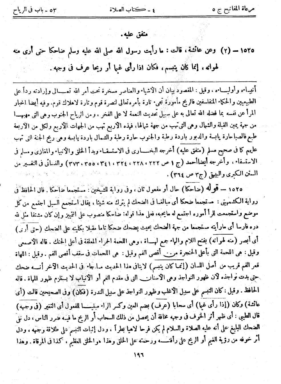 1525- (2) وعن عائشة، قالت: ((ما رأيت رسول الله صلى الله عليه وسلم ضاحكاً حتى أرى منه لهواته، إنما كان يبتسم، فكان إذا رأى غيماً أو ريحاً عرف في وجهه))
