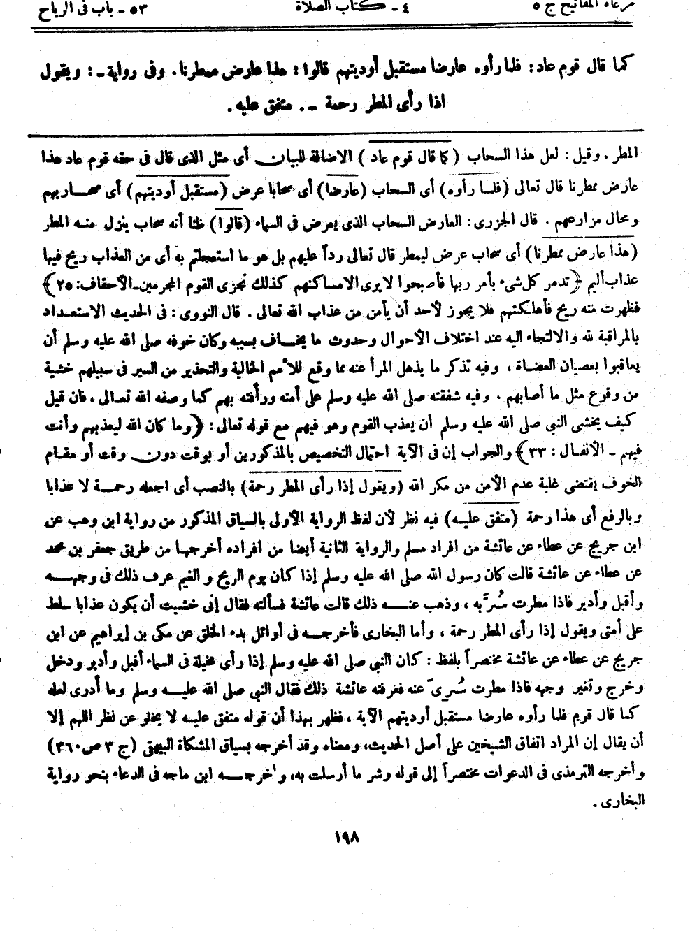 المطر. وقيل: لعل هذا السحاب (كما قال قوم عاد) الإضافة للبيان، أي مثل الذي قال في حقه قوم عاد هذا عارض ممطرنا قال تعالى: {فلما رأوه} أي السحاب {عارضاً} أي سحاباً عرض {مستقبل أوديتهم} أي صحاريهم ومحال مزارعهم. قال الجزري: العارض السحاب الذي يعرض في السماء (قالوا) ظناً أنه سحاب ينزل منه المطر {هذا عارض ممطرنا} ، أي سحاب عرض ليمطر قال تعالى رداً عليهم: {بل هو ما استعجلتم به} أي من العذاب {ريح فيها عذاب أليم} {تدمر كل شيء بأمر ربها فأصبحوا لا يرى إلا مساكنهم كذلك نجزي القوم المجرمين} [الأحقاف:25] فظهرت منه ريح فأهلكتهم فلا يجوز لأحد أن يأمن من عذاب الله تعالى. قال النووي: في الحديث الاستعداد بالمراقبة لله والالتجاء إليه عند إختلاف الأحوال وحدوث ما يخاف بسببه، وكان خوفه صلى الله عليه وسلم أن يعاقبوا بعصيان العضاة، وفيه تذكر ما يذهل المرأ عنه مما وقع للأمم الخالية والتحذير من السير في سبيلهم خشية من وقوع مثل ما أصابهم. وفيه شفقته صلى الله عليه وسلم على أمته ورأفته بهم كما وصفه الله تعالى، فإن قيل كيف يخشى النبي صلى الله عليه وسلم أن يعذب القوم وهو فيهم مع قوله تعالى: {وما كان الله ليعذبهم وأنت فيهم} [الأنفال:33] ، والجواب إن في الآية احتمال التخصيص بالمذكورين أو بوقت دون وقت أو مقام الخوف يقتضي غلبة عدم الأمن من مكر الله، (ويقول إذا رأى المطر رحمة) بالنصب أي اجعله رحمة لا عذاباً وبالرفع أي هذا رحمة (متفق عليه) فيه نظر؛ لأن لفظ الرواية الأولى بالسياق المذكور من رواية ابن وهب عن ابن جريج عن عطاء عن عائشة من إفراد مسلم والرواية الثانية أيضاً من إفراده أخرجها من طريق جعفر بن محمد عن عطاء عن عائشة قالت: كان رسول الله صلى الله عليه وسلم إذا كان يوم الريح والغيم عرف ذلك في وجهه وأقل وأدبر فإذا مطرت سربه، وذهب عنه ذلك قالت عائشة: فسألته فقال: إني خشيت أن يكون عذاباً سلط على أمتي ويقول إذا رأى المطر رحمة، وأما البخاري فأخرجه في أوائل بدء الخلق عن مكي بن إبراهيم عن ابن جريج عن عطاء عن عائشة مختصراً بلفظ: كان النبي صلى الله عليه وسلم إذا رأى مخيلة في السماء أقبل وأدبر ودخل وخرج وتغير وجهه فإذا مطرت سري عنه فعرفته عائشة ذلك فقال النبي صلى الله عليه وسلم: وما أدري لعله كما قال قوم {فلما رأوه عارضا مستقبل أوديتهم} الآية، فظهر بهذا أن قوله متفق عليه لا يخلو عن نظر اللهم إلا أن يقال إن المراد اتفاق الشيخين على أصل الحديث، ومعناه وقد أخرجه بسياق المشكاة البيهقي (ج3:ص360) وأخرجه الترمذي في الدعوات مختصراً إلى قوله وشر ما أرسلت به وأخرجه ابن ماجه في الدعاء بنحو رواية البخاري.