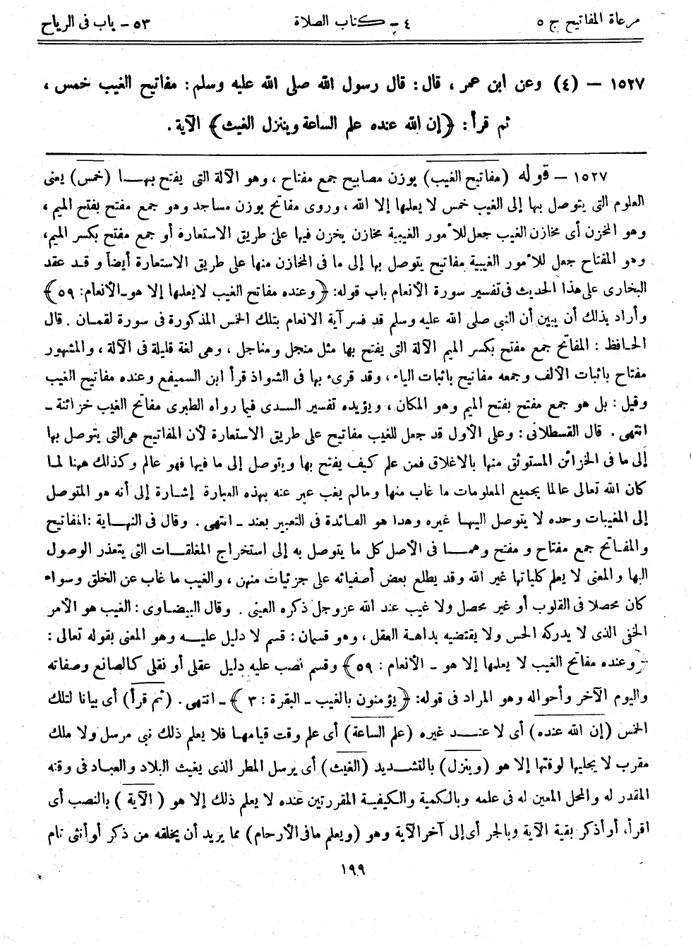 1527- (4) وعن ابن عمر، قال: قال رسول الله صلى الله عليه وسلم: ((مفاتيح الغيب خمس، ثم قرأ {إن الله عنده علم الساعة وينزل الغيث} الآية))