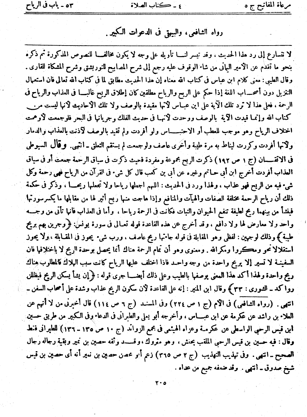 لا نتسارع إلى رد هذا الحديث، وقد تيسر لنا تأويله على وجه لا يكون مخالفاً للنصوص المذكورة ثم ذكره بنحو ما تقدم عن الأمير اليماني من شاء الوقوف عليه رجع إلى شرح المصابيح للتوربشتي وشرح المشكاة للقاري. وقال الطيبي: معنى كلام ابن عباس في كتاب الله معناه إن هذا الحديث مطابق لما في كتاب الله تعالى فإن استعمال التنزيل دون أصحاب اللغة إذا حكم على الريح والرياح مطلقين كان إطلاق الريح غالباً في العذاب والرياح في الرحمة، فعلى هذا لا ترد تلك الآية على ابن عباس؛ لأنها مقيدة بالوصف ولا تلك الأحاديث؛ لأنها ليست من كتاب الله وإنما قيدت الآية بالوصف ووحدت؛ لأنها في حديث الفلك وجريانها في البحر فلو جمعت لأوهمت اختلاف الرياح وهو موجب للعطب أو الاحتباس ولو أفردت ولم تقيد بالوصف لآذنت بالعذاب والدمار؛ ولأنها أفردت وكررت ليناط به مرة طيبة وأخرى عاصف ولو جمعت لم يستقم التعلق- انتهى. وقال السيوطي في الإتقان (ج1ص192) ذكرت الريح مجموعة ومفردة فحيث ذكرت في سياق الرحمة جمعت أو في سياق العذاب أفردت أخرج ابن أبي حاتم وغيره عن أبي بن كعب قال كل شيء في القرآن من الرياح فهي رحمة وكل شيء فيه من الريح فهو عذاب، لهذا ورد في الحديث: اللهم اجعلها رياحاً ولا تجعلها ريحاً، وذكر في حكمة ذلك أن رياح الرحمة مختلفة الصفات والهيآت والمنافع وإذا هاجت منها ريح أثير لها من مقابلها ما يكسر سورتها فينشأ من بينهما ريح لطيفة تنفع الحيوان والنبات فكانت في الرحمة رياحاً، وأما في العذاب فإنها تأتي من وجه واحد ولا معارض لها ولا دافع، وقد أخرج عن هذه القاعدة قوله تعالى في سورة يونس: {وجرين بهم بريح طيبة} وذلك لوجهين: لفظي وهو المقابلة في قوله: {جاءتها ريح عاصف} ، ورب شيء يجوز في المقابلة، ولا يجوز استقلالاً نحو {ومكروا ومكر الله} . ومعنوي وهو أن تمام الرحمة هناك أنما يحصل بوحدة الريح لا باختلافها فإن السفينة لا تسير إلا بريح واحدة من وجه واحد فإذا اختلف عليها الرياح كانت سبب الهلاك فالمطلوب هناك ريح واحدة ولهذا أكد هذا المعنى بوصفها بالطيب وعلى ذلك أيضاً جرى قوله: {إن يشأ يسكن الريح فيظللن رواكد} [الشورى: 33] وقال ابن المنير: إنه على القاعدة لأن سكون الريح عذاب وشدة على أصحاب السفن- انتهى. (رواه الشافعي) في الأم (ج1ص224) وفي المسند (ج6ص114) قال أخبرني من لا أتهم عن العلاء بن راشد عن عكرمة عن ابن عباس، وأخرجه أبويعلى والطبراني في الدعاء وفي الكبير من طريق حسين ابن قيس الرحبي الواسطي عن عكرمة وعزاه الهيثمي في مجمع الزوائد (ج10ص135- 136) للطبراني فقط وقال: فيه حسين بن قيس الرحبي الملقب بحنش، وهو متروك، وقد وثقه حصين بن نمير وبقية رجاله رجال الصحيح- انتهى. وفي تهذيب التهذيب (ج2ص365) زعم أبومحصن حصين بن نمير أنه أي حصين بن قيس شيخ صدوق- انتهى. وقد ضعفه جميع من عداه.