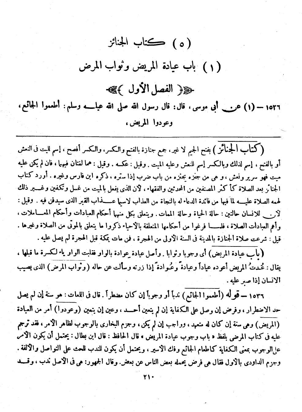 (كتاب الجنائز) بفتح الجيم لا غير، جمع جنازة بالفتح والكسر، والكسر أفصح، اسم للميت في النعش أو بالفتح، اسم لذلك وبالكسر اسم للنعش وعليه الميت. وقيل: عكسه. وقيل: هما لغتان فيهما، فإن لم يكن عليه ميت فهو سرير ونعش، وهي من جنزه يجنزه من باب ضرب إذا ستره، ذكره ابن فارس وغيره. أورد كتاب الجنائز بعد الصلاة كأثر المصنفين من المحدثين والفقهاء، لأن الذي يفعل بالميت من غسل وتكفين وغير ذلك لهمه الصلاة عليه لما فيها من فائدة الدعاء له بالنجاة من العذاب لاسيما عذاب القبر الذي سيدفن فيه. وقيل: لأن للإنسان حالتين: حالة الحياة وحالة الممات. ويتعلق بكل منهما أحكام العبادات وأحكام المعاملات، وأهم العبادات الصلاة، فلما فرغوا من أحكامها المتعلقة بالأحياء ذكروا ما يتعلق بالموتى من الصلاة وغيرها. قيل: شرعت صلاة الجنازة بالمدينة في السنة الأولى من الهجرة، فمن مات بمكة قبل الهجرة لم يصل عليه.